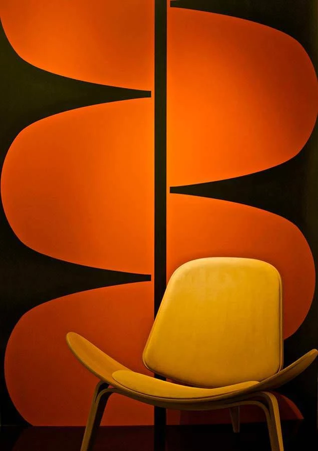 Wie eine Spirale windet sich das großflächige Muster in leuchtendem, glänzendem Orangerot um den mattschwarzen Untergrund. Die handbedruckte Vliestapete aus dem Hause Flavor Paper kommt in großzügigen Räumen bestens zur Geltung. Mit ihrer kräftigen Musterfarbe im Stil der 70er Jahre hat sie eine belebende, energiegeladene Ausstrahlung und verträgt ebenso charakterstarke Möbel. Lieferbar ab einer Mindestmenge von drei Rollen.