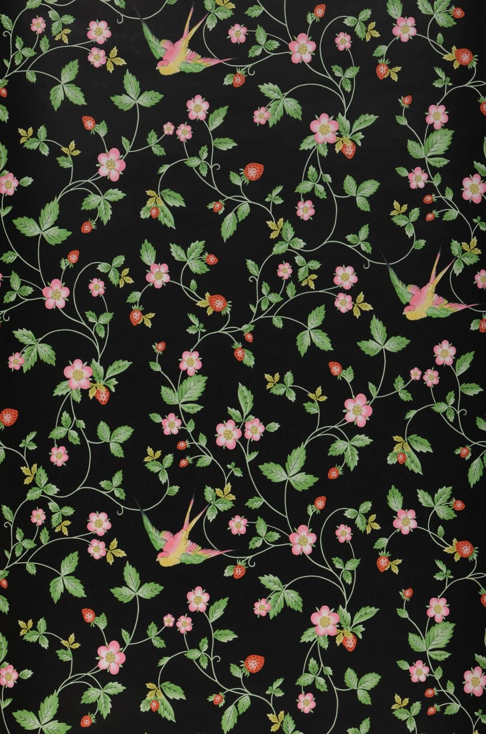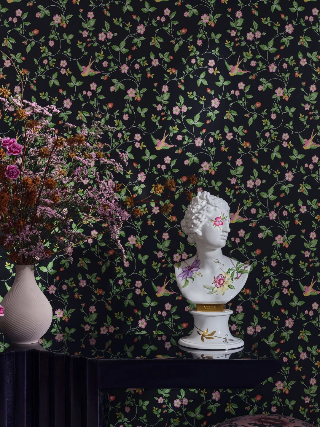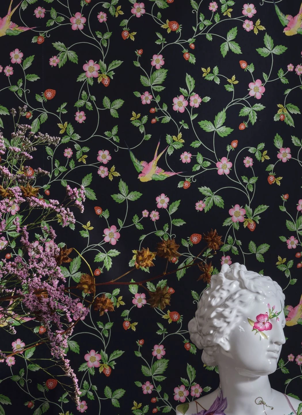 Wie Juwelen leuchten die reifen roten Erdbeeren, ihre zarten Blüten und die grünen Erdbeerblätter aus dem schwarzen Untergrund der Tapete hervor. Doch der eigentliche Clou sind die Schwalben mit ihrem Gefieder in bunten Bonbonfarben! Übersät mit den Blüten und Früchten, wird Ihre Wand zu einer echten Attraktion. Mit einer der Musterfarben, schwarzen oder weißen Elementen unterstreichen Sie die Wirkung der Tapete perfekt.
