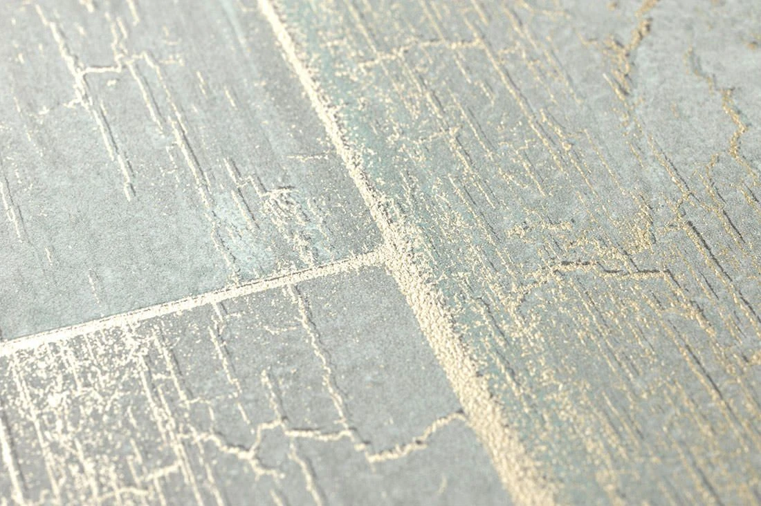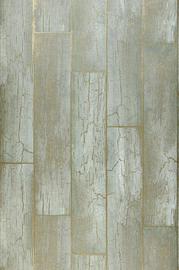 Altes Holz mit Charakter und Strukturen, wie sie die Natur nicht schöner zeichnen kann – Das ist Design Tapete Atoras im Holzlook. Schmücken Sie den Raum mit diesen angesagten verwitterten Holzplanken in Pastellgrün mit feinen Goldschimmer-Details. Shabby Chic, Country Look, Natur-Räume erhalten wohlige Struktur und geheimnisvollen Glanz.