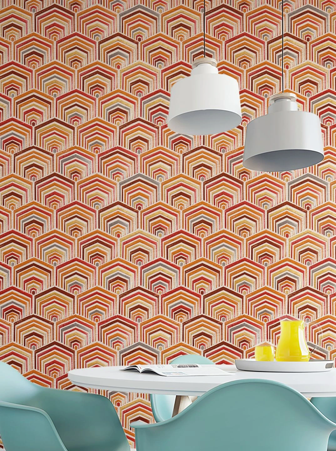 Baccara verbindet ausgefallenes Retro-Design mit der modernen, praktischen Vinyltapete. Die grafischen Elemente, die mehreckige bogenartige Strukturen bilden, erzeugen einen dreidimensionalen Effekt, der durch das verwendete Orientrot, Orange, Braunbeige und Dunkelgrau auf dem hellen elfenbeinfarbenen Grund betont wird. Auch die Beschaffenheit der hoch waschbeständigen Vinyloberfläche unterstützt die fast hypnotische Wirkung durch fein geprägte Schraffuren.