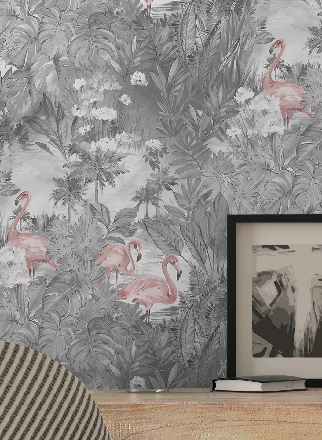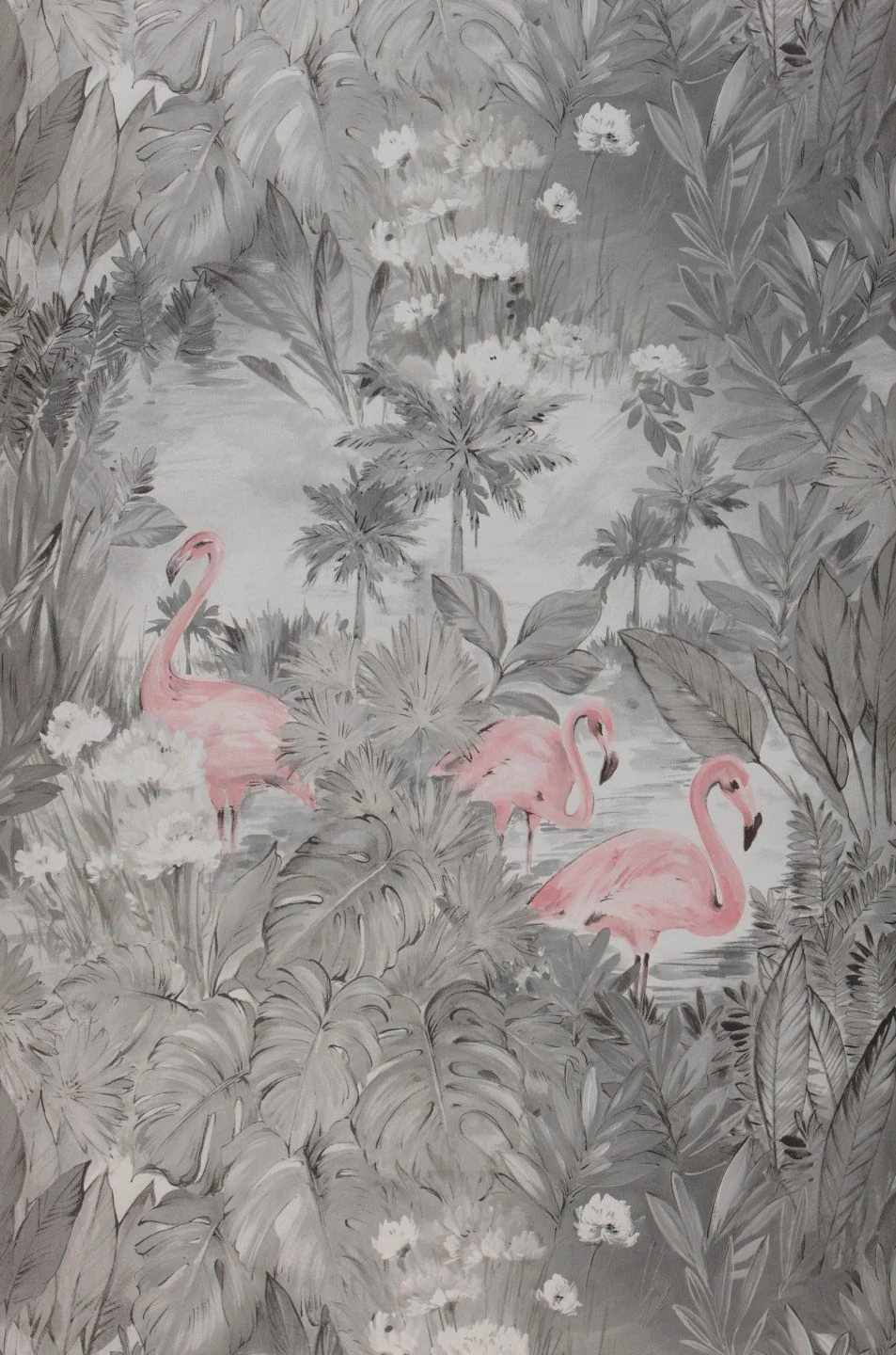 Inmitten von tropischen Palmen, Blattpflanzen und Blumen in einer Seenlandschaft stehen elegante, naturgetreu dargestellte Flamingos. Das zarte Rosa ihres Gefieders tritt aus der wie eine Schwarzweißaufnahme in Grautönen gehaltenen Landschaft deutlich hervor. Vordergrund und Hintergrund gehen nahtlos ineinander über und vermischen sich auf dieser Vliestapete, die eine fast magische Atmosphäre erzeugt.