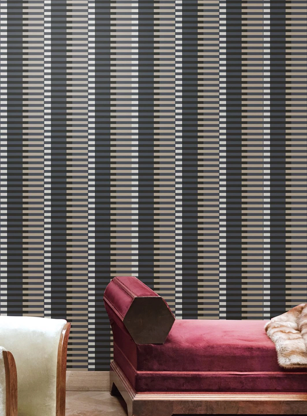 Effekthascherei, die eine Illusion vorgibt, ist die Spezialität von Designtapete Basma. Die schönsten Nuancen von Grau erschaffen hier Streifensäulen, die optisch mehrere Ebenen einnehmen und Tiefe vermitteln. Basma macht Spaß, weil sie von nah und fern betrachtet unterschiedliche Perspektiven eröffnet.