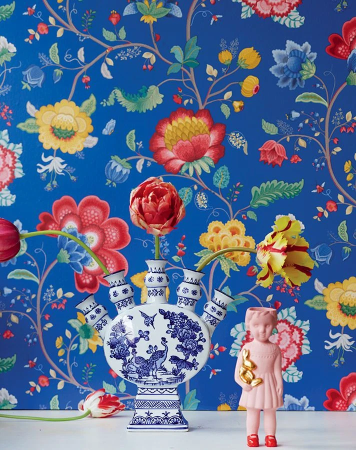 Lebhafte Farben und filigran stilisierte Blüten und Blätter machen diese dekorative Vliestapete zu einem Quell der Energie. Das Goldgelb, Himbeerrot und Patinagrün stehen in attraktivem Kontrast zum tiefen, Ruhe verströmenden Enzianblau des Untergrunds, das den fröhlichen Farben der Blumen Halt gibt. Für ein Wohnzimmer voller Lebensfreude oder ein Schlafzimmer, in dem Sie Kraft für den nächsten Tag schöpfen, ist die Tapete ein wunderschöner Wandschmuck.