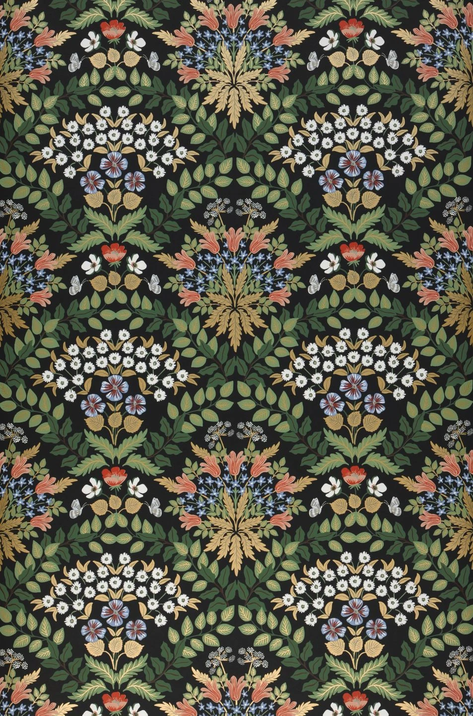 Besonders edel wirken die farbenprächtigen Arrangements zierlicher, fein gezeichneter Blüten wie Veilchen und Vergissmeinnicht auf dem schwarzen Untergrund der Vliestapete Bramble. Mit einem sicheren Gespür fürs Detail bis hin zu der Zeichnung der Blütenblätter verbindet Rifle Paper die klassische Anordnung der Ornamente mit einer zeitlos aktuellen Ästhetik. Sie fügen dunklen Einrichtungen tolle Farben hinzu oder erden Ihre Möbel in einer der Musterfarben.