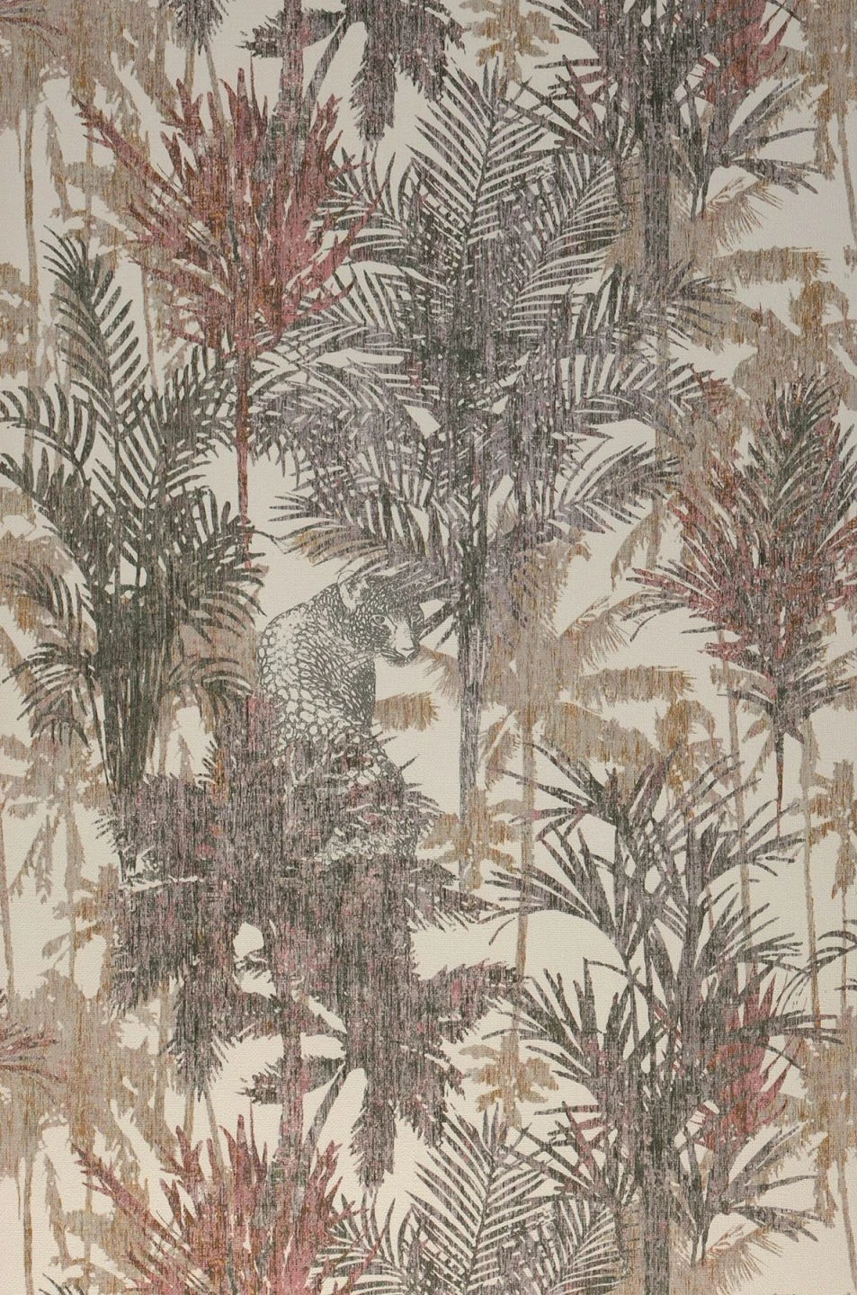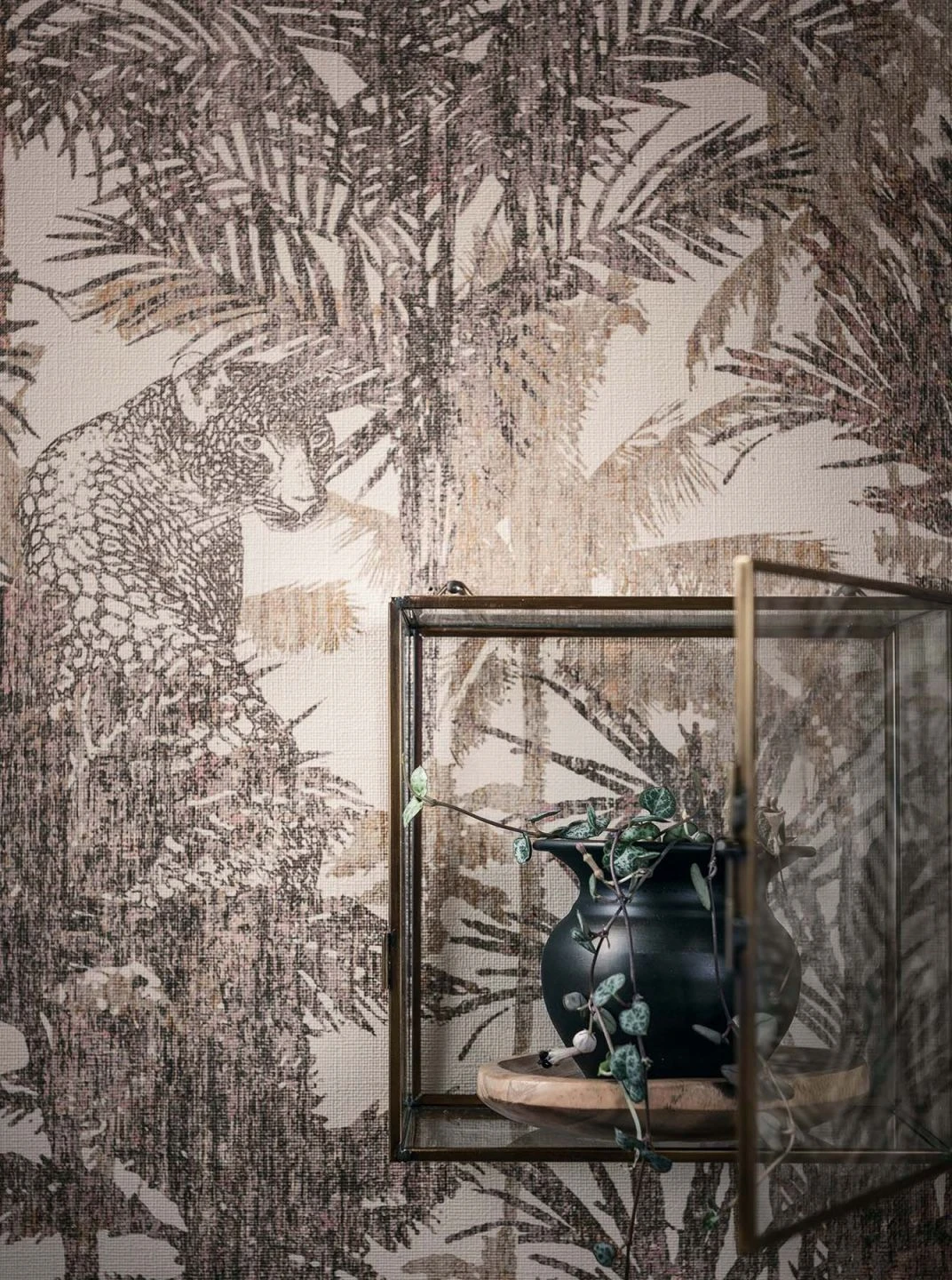 Man muss schon etwas genauer hinsehen, um den großen Leoparden in dieser exotischen Palmenszenerie zu entdecken. Dieser reizvolle Effekt in Verbindung mit dem textilartigen hochwertigen Strukturdesign macht Vinyltapete Casaba zu einem Überraschungskünstler, der auch in stark beanspruchten Räumen zum Einsatz kommen kann.