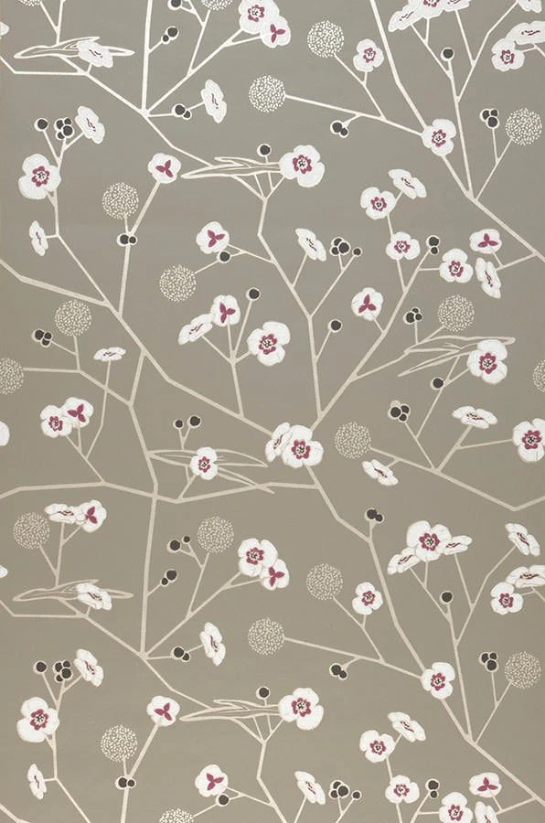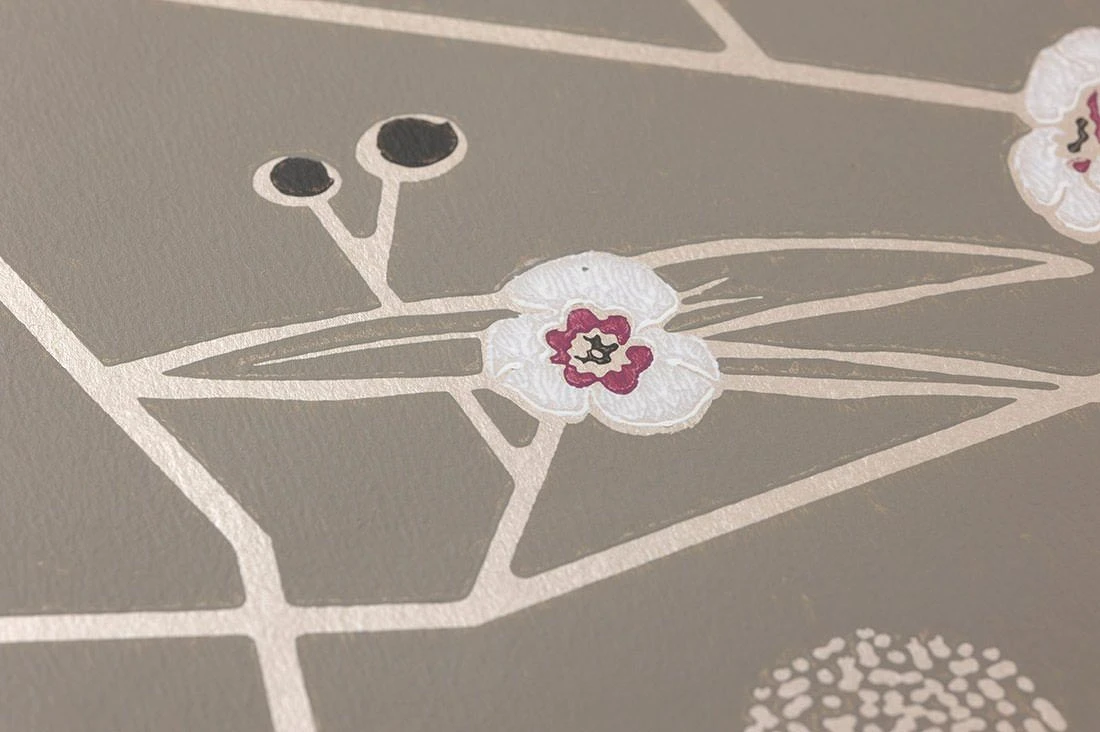 Diese Blumentapete, angelehnt an den grafischen Stil der 1950er Jahre, zeigt sich lebhaft und bildet in sich viele verschiedene Musterstrukturen. Der geschickte Farbenmix aus Schwarzbraun, Creme Schimmer, Weiß und Bordeauxviolett lässt das Rankenmuster Geschichte erzählen. Durch hochwertigen Leimdruck ergibt sich eine zusätzliche feine Dynamik für das Auge.