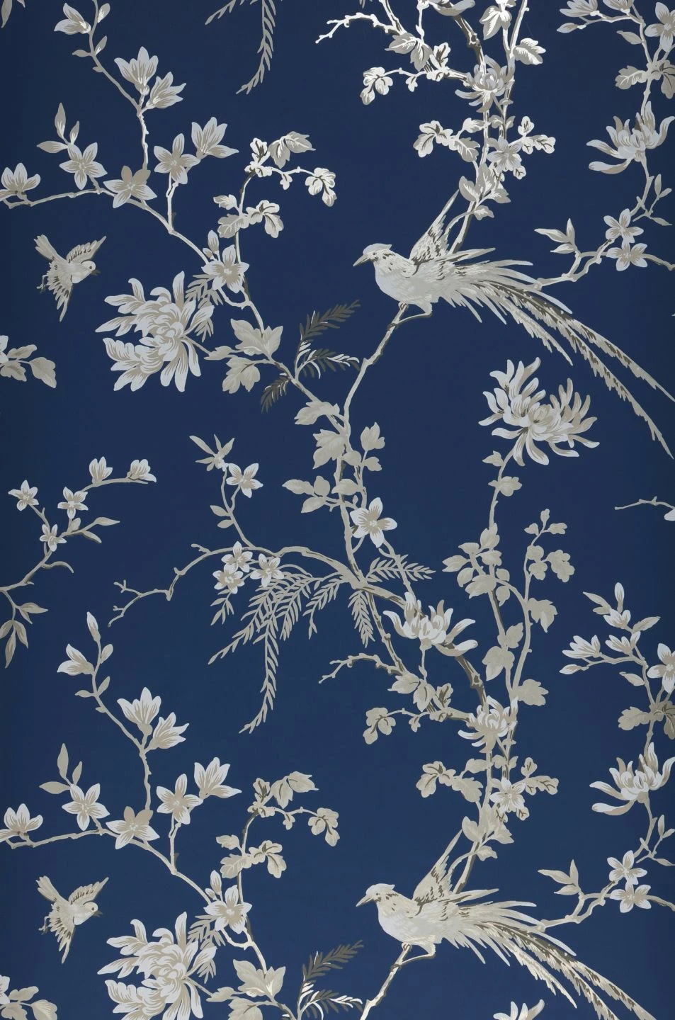 Das märchenhafte Design und der Zauber von Weiß, hellen Grautönen und silbernem Schimmer auf dunkelblauem Grund verwandeln Ihren Raum auf faszinierende Weise. Die Vögel mit fantastischen Schmuckfedern auf blühenden Zweigen strahlen die scheinbar mühelose Eleganz der asiatischen Kunst aus. Das traditionelle Leimdruckverfahren, in dem die Vliestapete hergestellt wurde, trägt zum edlen, hochwertigen Eindruck von Coringa bei.