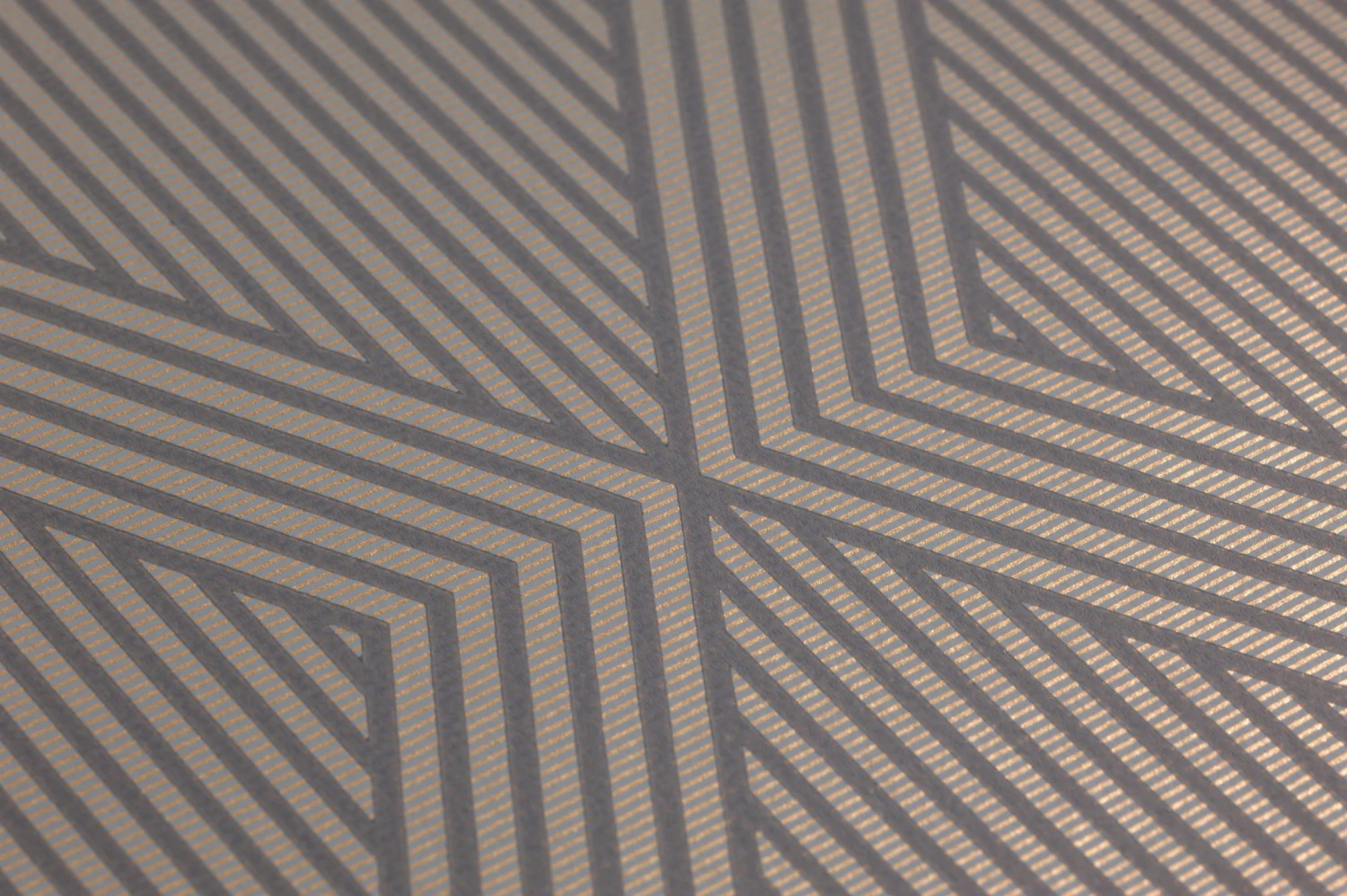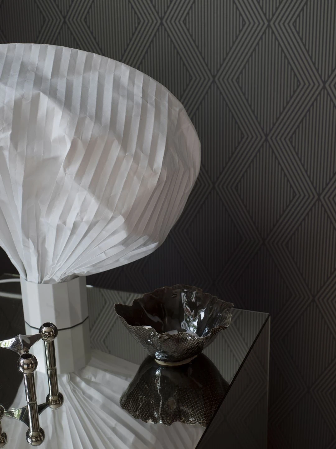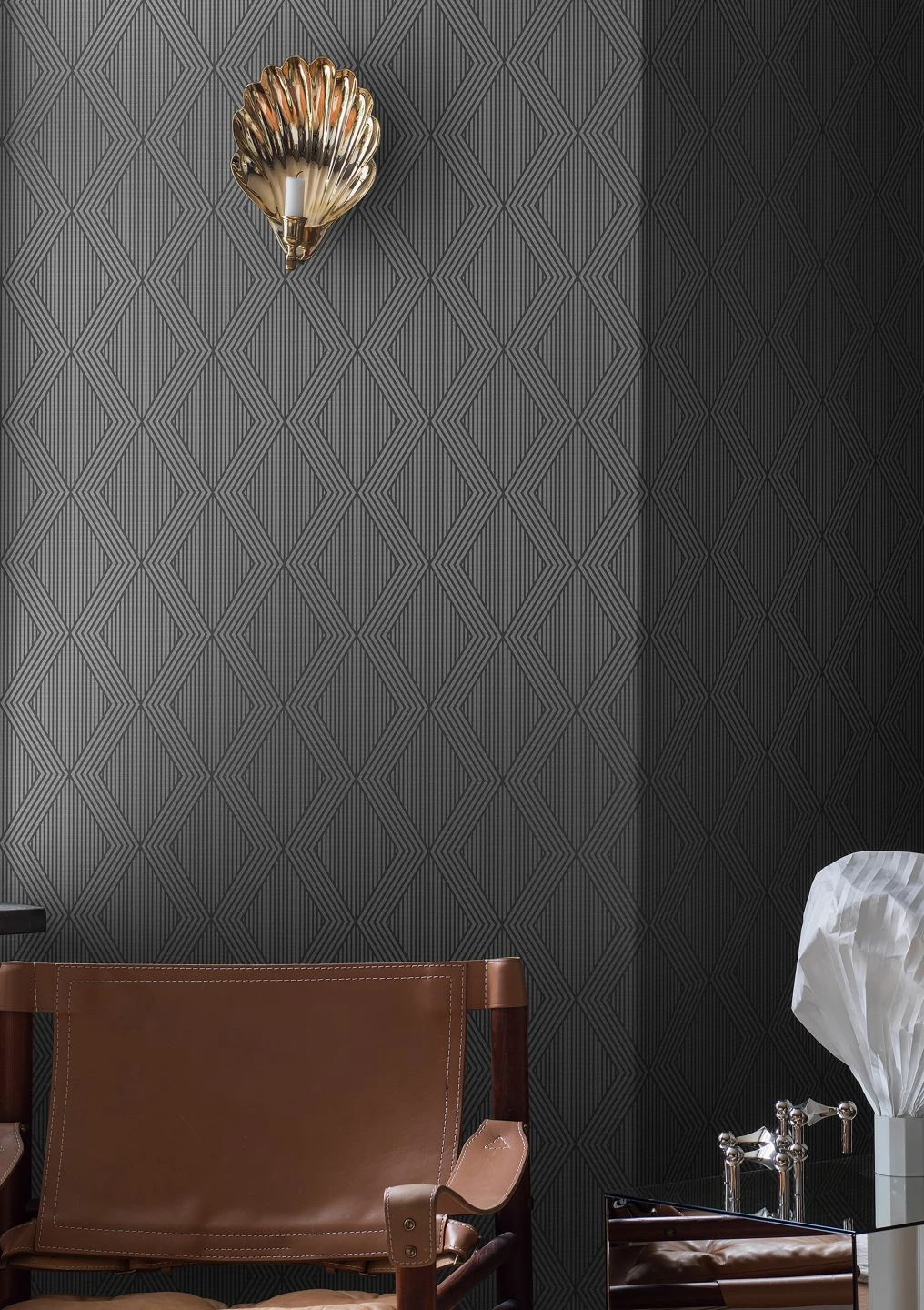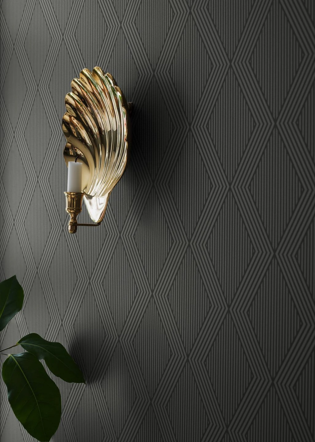 Schmale dunkelgraue Streifen wechseln sich mit Bändern in einem helleren Grau ab und bilden ein Muster aus Linien und Rauten. Die geometrische Tapete verströmt einen sanften Schimmer. Bei näherem Hinsehen offenbart Dalur ihr Geheimnis: Die grauen Streifen sind mit feinen Linien aus schimmernder Goldfarbe schraffiert. So ist dunkel nicht gleich dunkel, denn die entstehenden Lichtreflexe verleihen Ihrem Raum einen Hauch von dezentem Glamour.