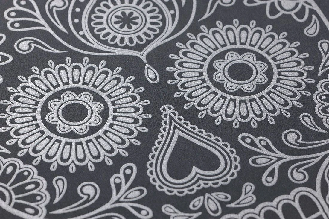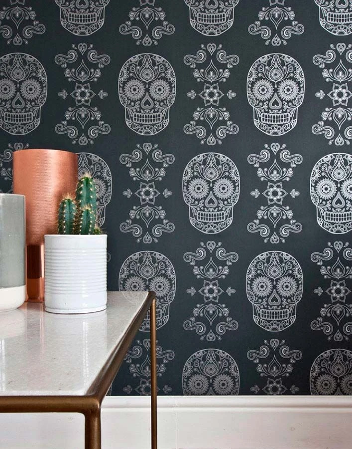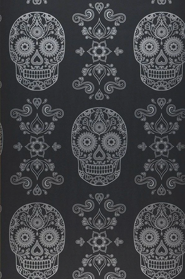Dia de los Muertos steht im Mexikanischen für den „Tag der Toten“, einer der höchsten Feiertage in Mexiko, der bunt und fröhlich gefeiert wird. Die skurrile Design Tapete mit Ornament-Totenköpfen in Schwarzgrau-Silber ist für ausgefallene Raumstyles gleichermaßen ein Freudenfest. Und sogar eines, das mit Licht eine schimmernde Beziehung eingeht.