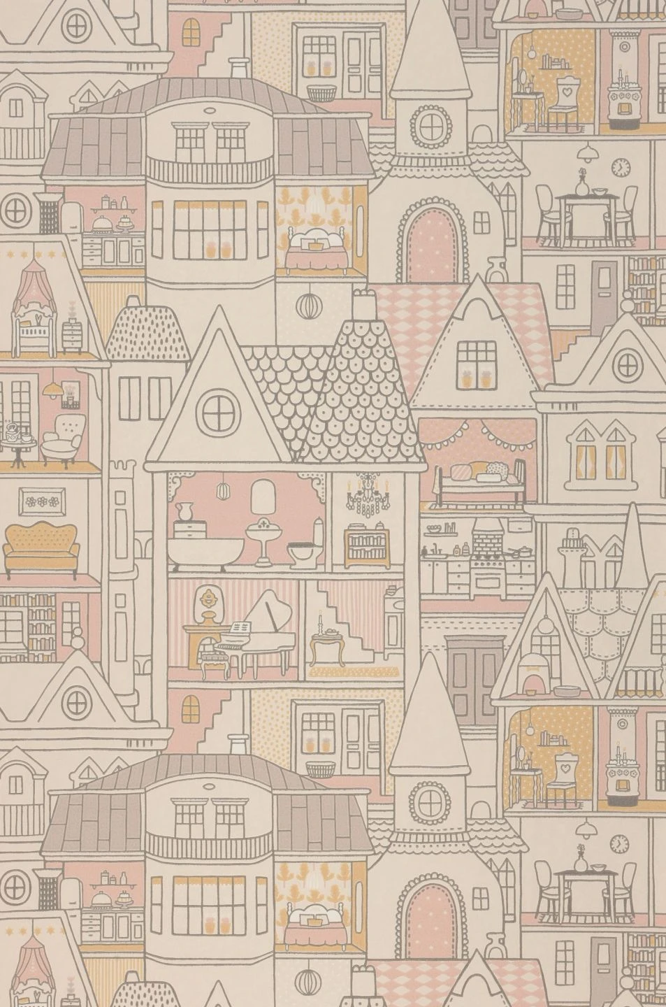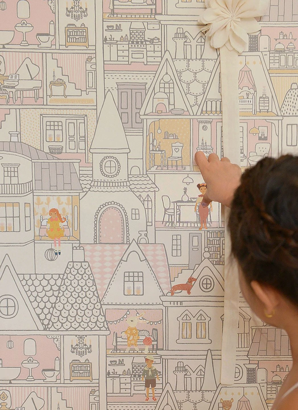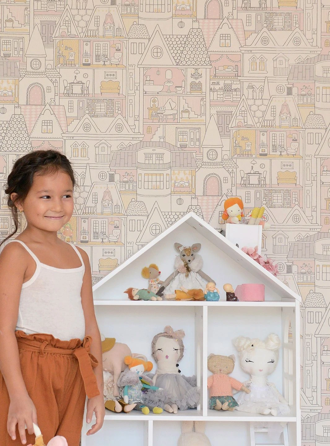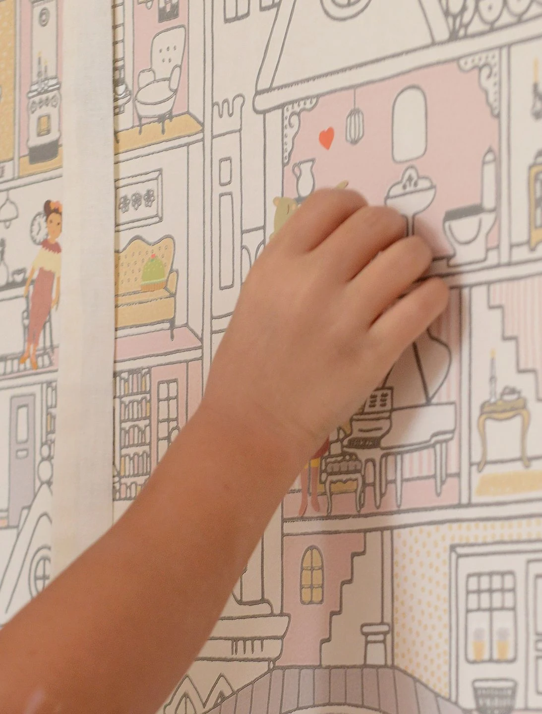In dieser kleinen Stadt kann man in die Häuser hineinsehen wie in Puppenstuben! Auf dem cremeweißen Grund sind verschiedene Häuser und die Zimmer darin mit Umrissen und einigen wenigen Farben eingezeichnet und animieren die kindliche Phantasie dazu, sich die Geschichten der Familien vorzustellen, die die Zimmer bewohnen. Mit den passenden, mehrfach verwendbaren Aufklebern zur Tapete werden die Geschichten lebendig und regen zum kreativen Spielen an.