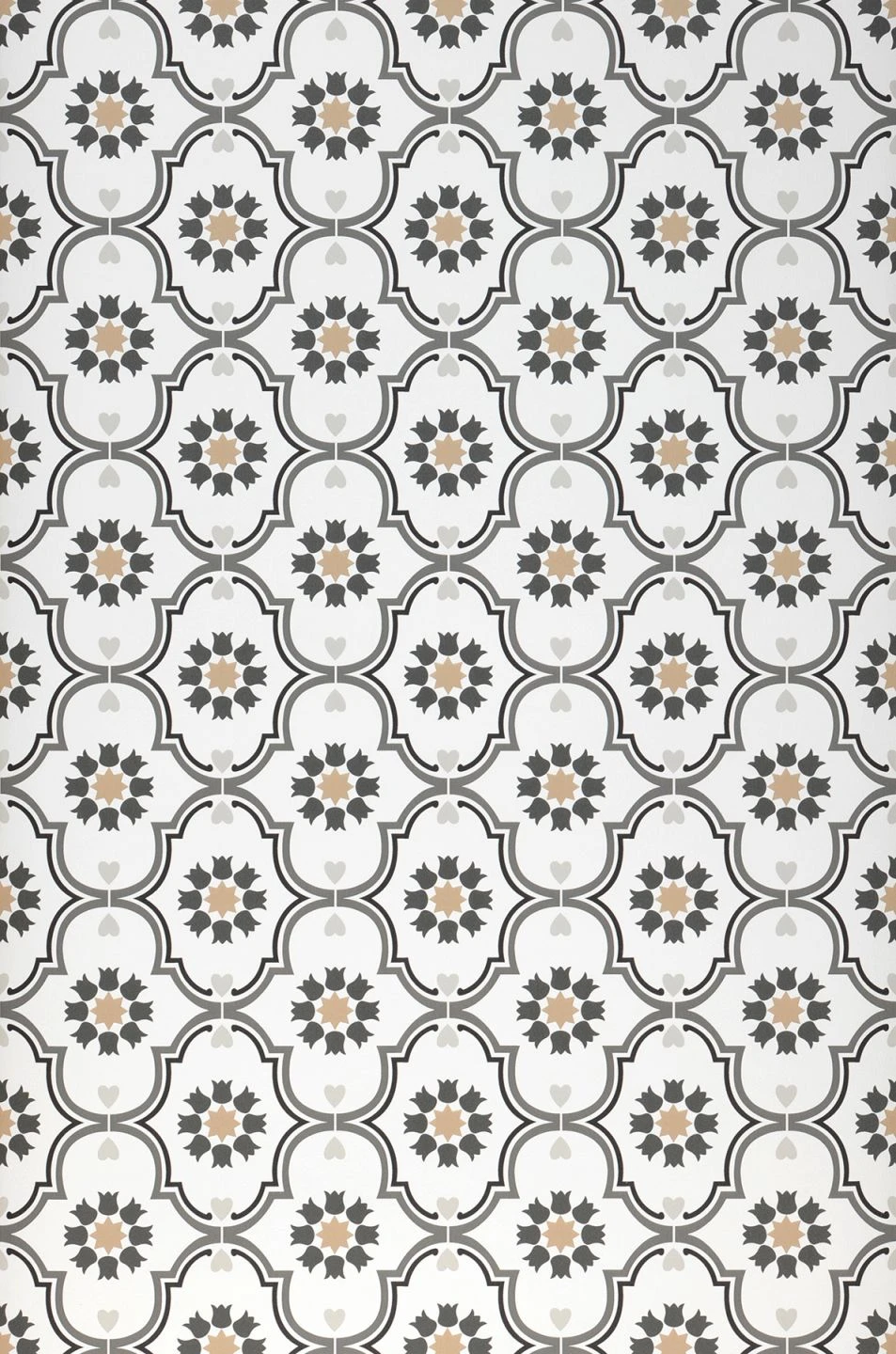 Orientalische Kunst trifft Barock und wird zu einem stylischen Fliesenmuster im Stil der 70er Jahre. Die Musterfarben Beige, Dunkelgrau, Grau, Hellgrau, Schwarz sorgen für eine klare Farblinie, die im Raum ihresgleichen sucht. Designer Möbel der Panton Ära ergänzen die mondäne Retro Tapete perfekt.