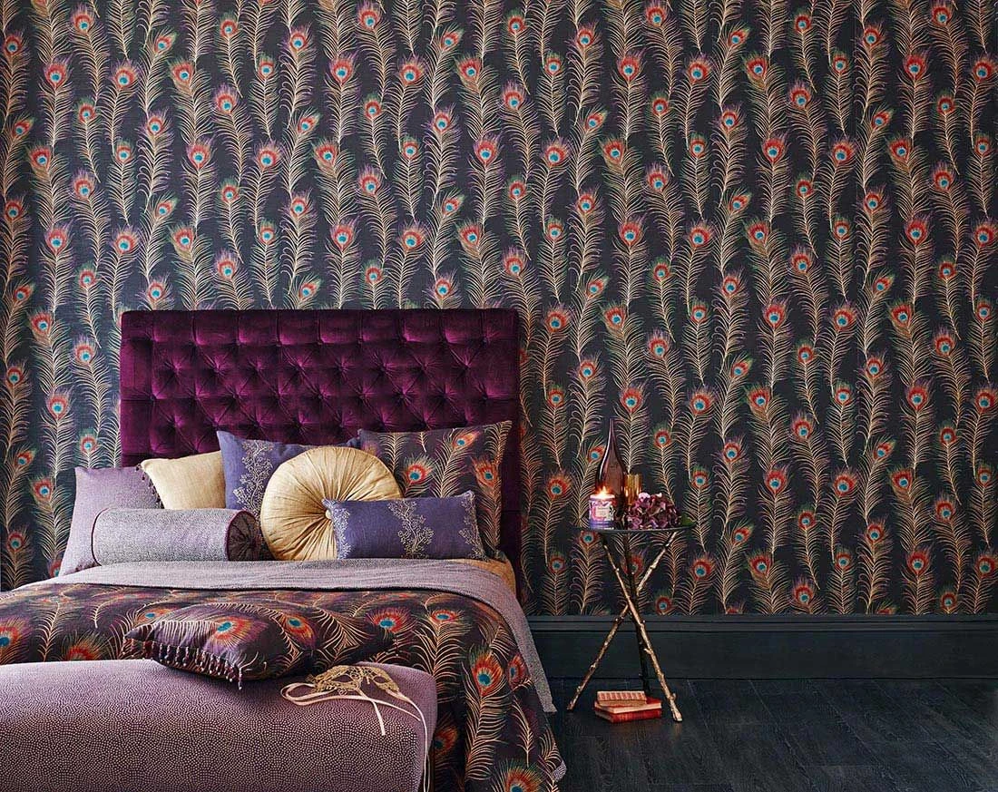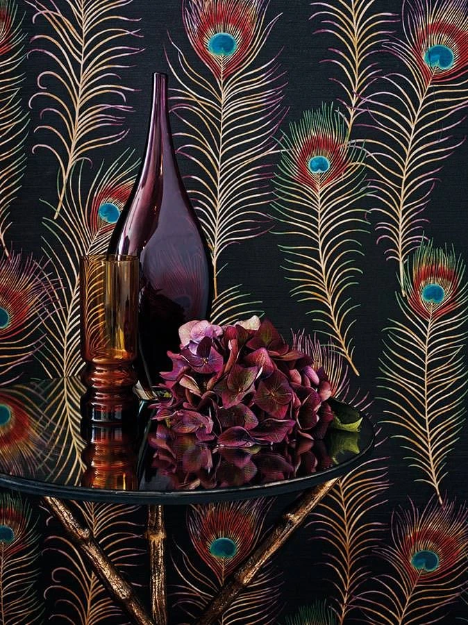 Der Pfau symbolisiert Eleganz und Schönheit, sein schillerndes Federkleid übt schon seit Jahrhunderten einen besonderen Reiz auf uns aus. Was wäre da naheliegender, als die eigenen 4 Wände mit dieser bunten Pracht auf anthrazitfarbenen Untergrund zu schmücken?