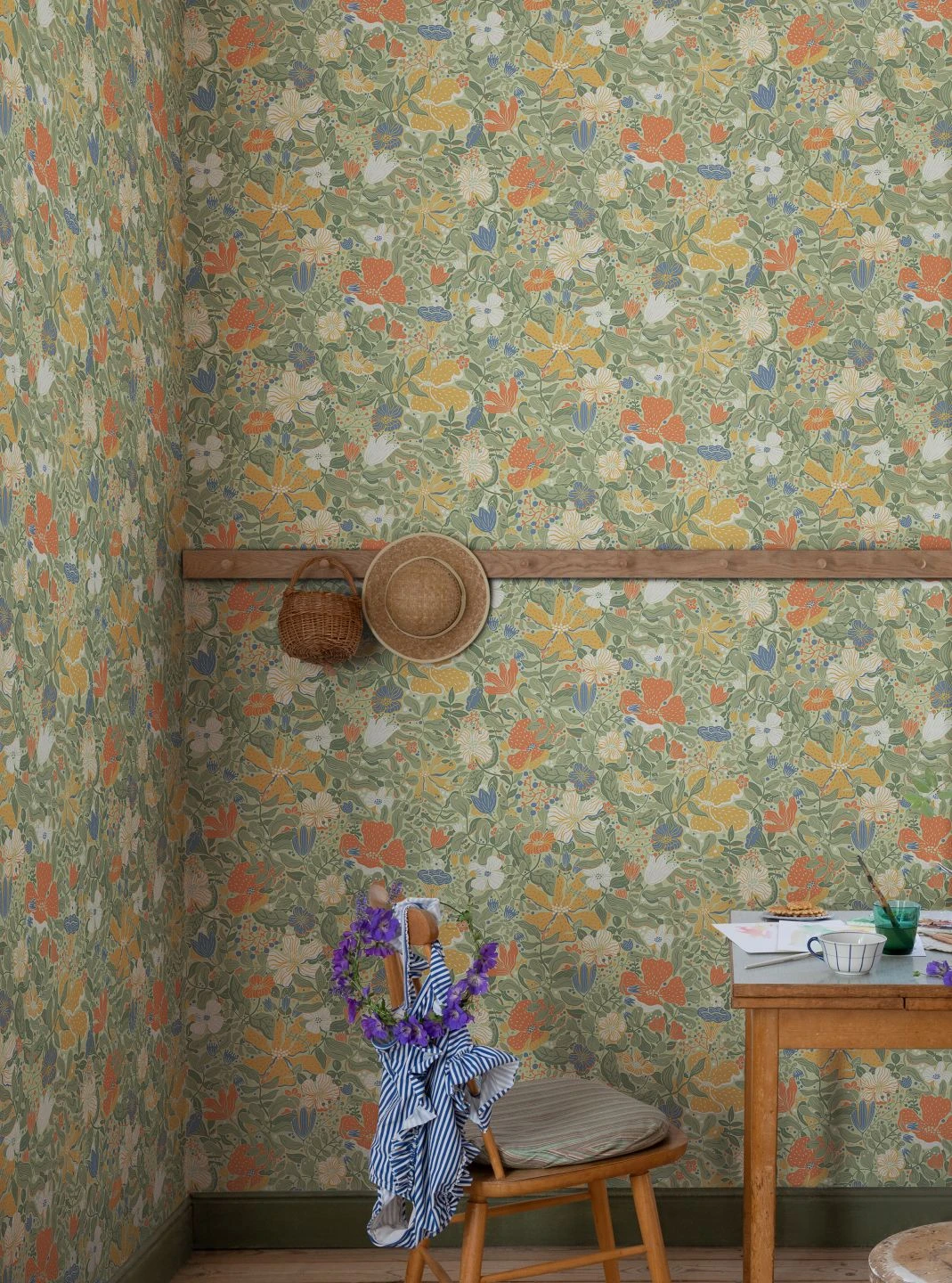 Die bunten Farben dieser prächtig ausgearbeiteten Blumentapete sind leicht gedeckt und verströmen eine Andeutung von sympathischer Nostalgie. Ihre Buntheit wird so gefasst und in einen ästhetischen Zusammenhang gestellt. Ähnliches leisten die phantastischen Formen von Blüten und Blättern, die bewegt und lebhaft wirken. Vliestapete Elsie belebt Ihren Raum mit der unerschöpflichen Vielfalt ihres Blütenmeers.