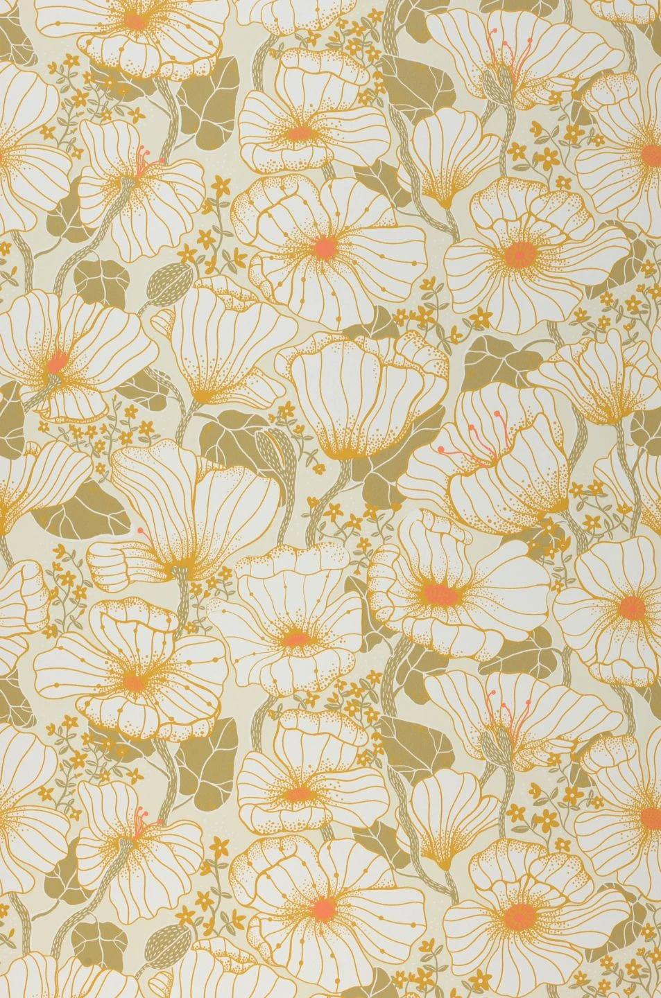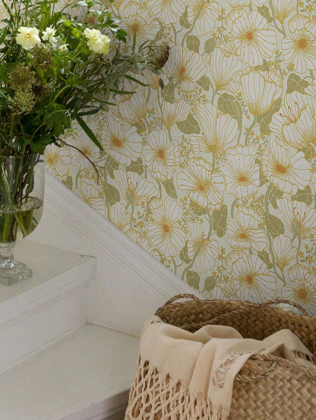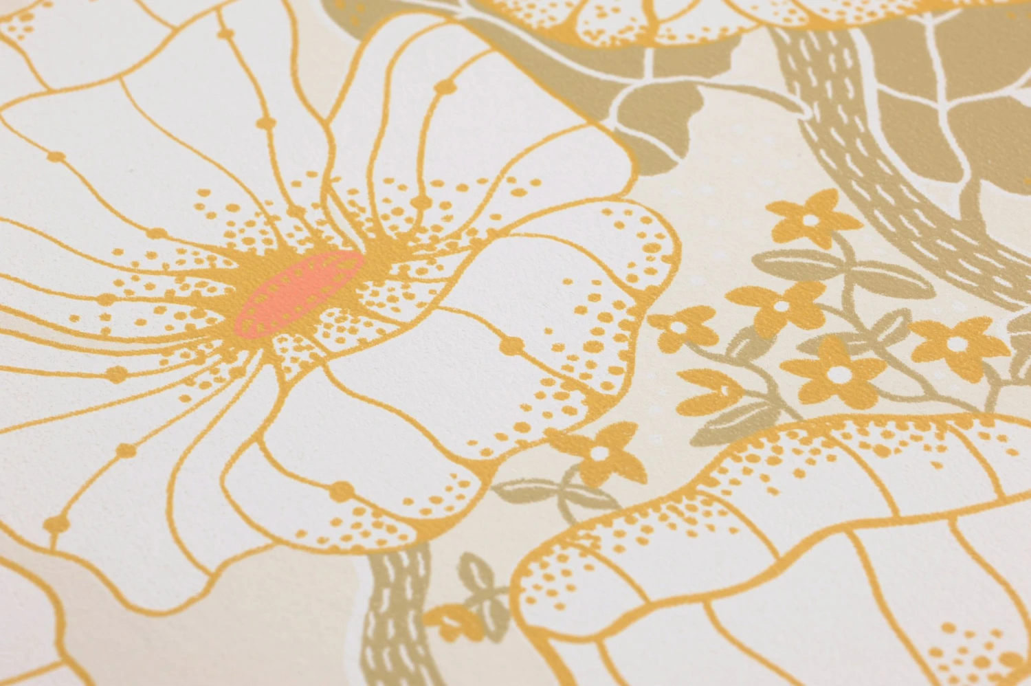 Große weiße Blüten, abgesetzt mit Gelb- und Orangetönen, nehmen fast die ganze Fläche Ihrer Wand ein und verzaubern sie mit ihrer beinahe fühlbaren Zartheit. Zwischen ihnen und den olivgelben Blättern beleben zierliche sternförmige Blümchen den cremefarbenen Grund. Der Blütenzauber wirkt leicht und duftig und lässt das Sonnenlicht, das durch Ihre Fenster einfällt, seine ganze Wirkung entfalten.