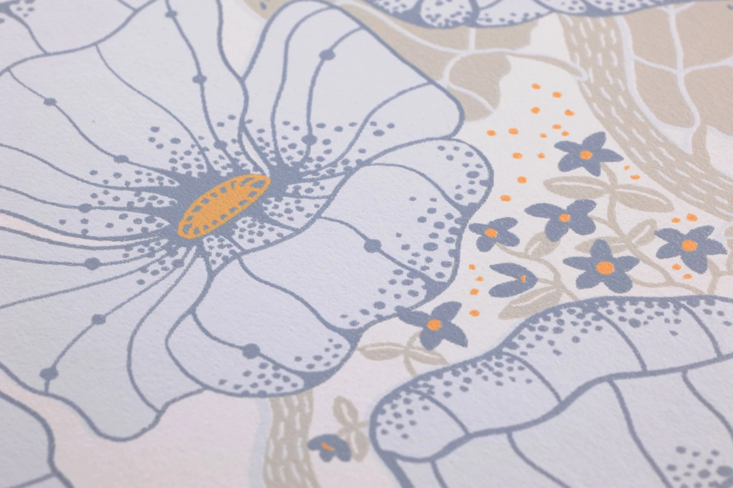Fast durchscheinend wirken die großen, zartblauen Blüten, zwischen denen die olivgrauen Blätter fast mit dem cremeweißen Untergrund verschmelzen. Die graublaue Zeichnung der Blüten, die orangefarbenen Details und die kleinen sternförmigen Blüten in den Zwischenräumen erschaffen eine zauberhaft ausgeglichene Atmosphäre. Zwischen hellen Schlafzimmermöbeln oder in Ihrem Wohnzimmer macht die Vliestapete Ewa eine gute Figur.