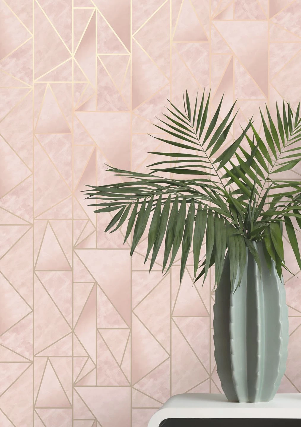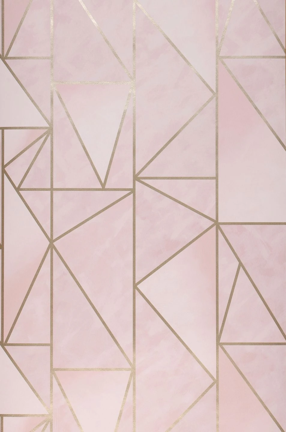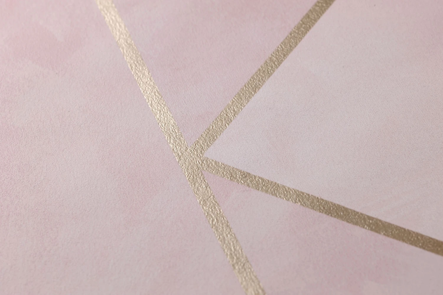 Ein Traum in Rosa: Schmale Linien in schimmerndem Perlbeige unterteilen die Tapetenbahn in zartrosafarbene Dreiecke verschiedener Größe und Anordnung. Die geometrischen Formen erhalten sanfte Struktur durch die leicht schattierte Einfärbung und die allmählichen Übergängen zwischen den Rosatönen. Ein edles Wohnzimmer oder ein romantisches Schlafzimmer erhalten durch die Vliestapete ihren ganz eigenen Charakter.