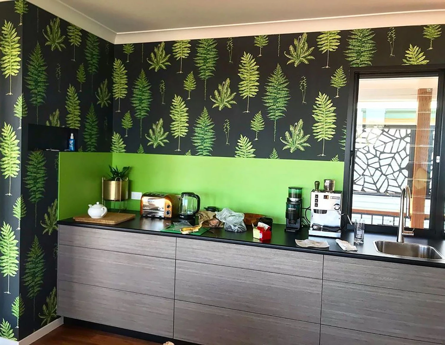Mit Schwarz als Grundfarbe zeigen die verschiedenen Farnblätter eine völlig neue Seite. Sie wirken geheimnisvoll, wie ein Spaziergang durch den tiefen Wald. Die reizvollen Details der verschiedenen Farne kommen durch den Kontrast deutlich zur Geltung. Die exquisite, abwaschbare Vliestapete fördert die Wahrnehmung und hat einen entspannenden Effekt.