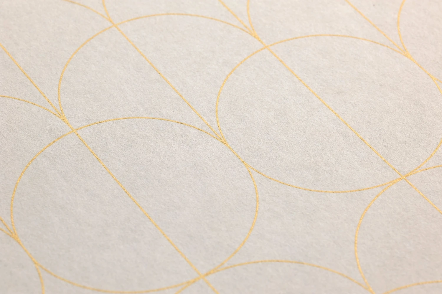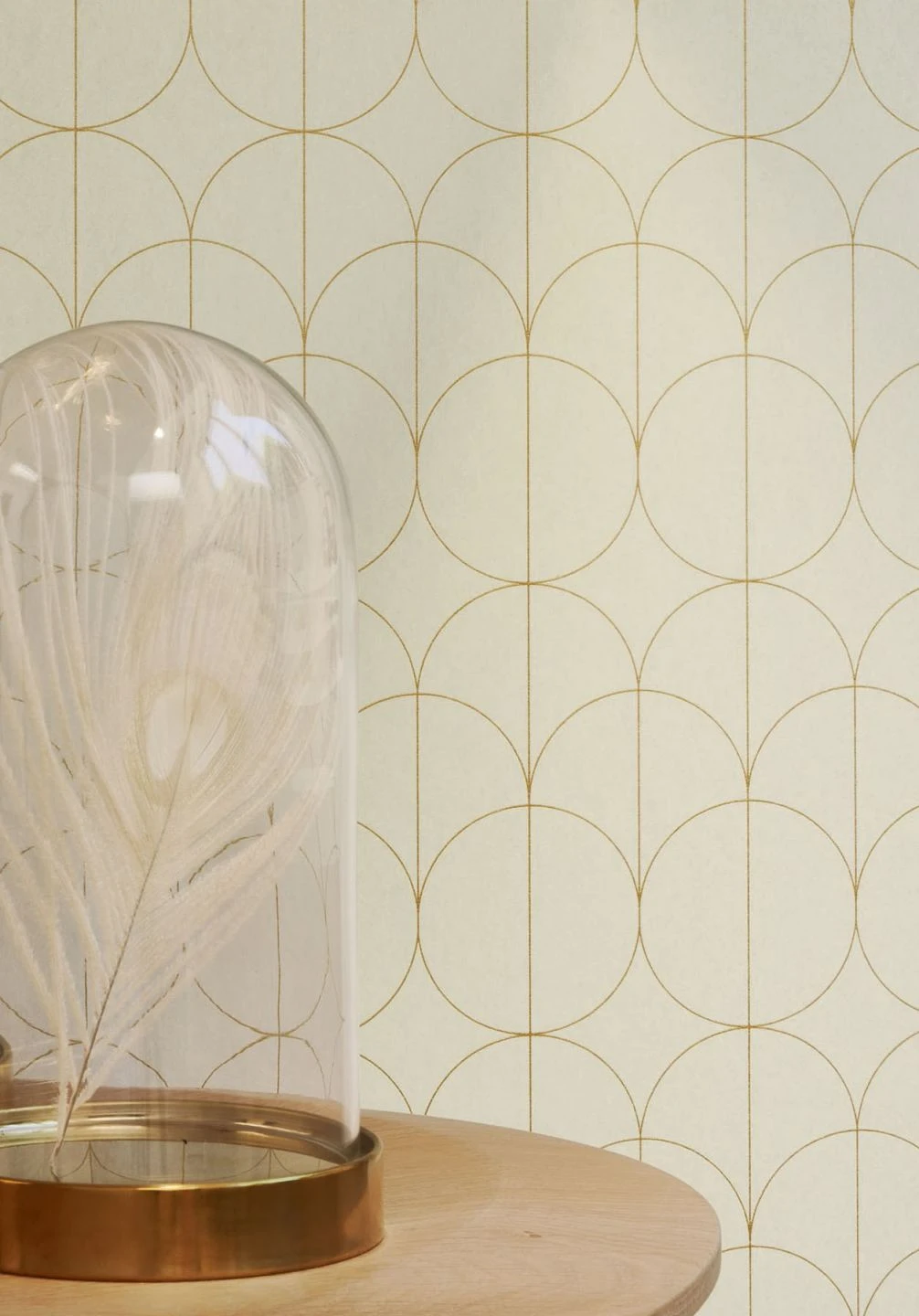 Luxuriösen Schick im Stil des Art Deco verströmt die Vliestapete „Havana“. Aus feinen, in Perlgold schimmernden Linien entstehen Bögen und Kreise wie ein kostbares, aus feinem Golddraht gearbeitetes Mobile. Die goldenen Ornamente entfalten im Kontrast zum matten grauweißen Untergrund ihre besondere Wirkung. Einrichtungselemente in der Ästhetik des Art Deco und gold- oder messingfarbene Dekoration ergänzen die Tapete perfekt.