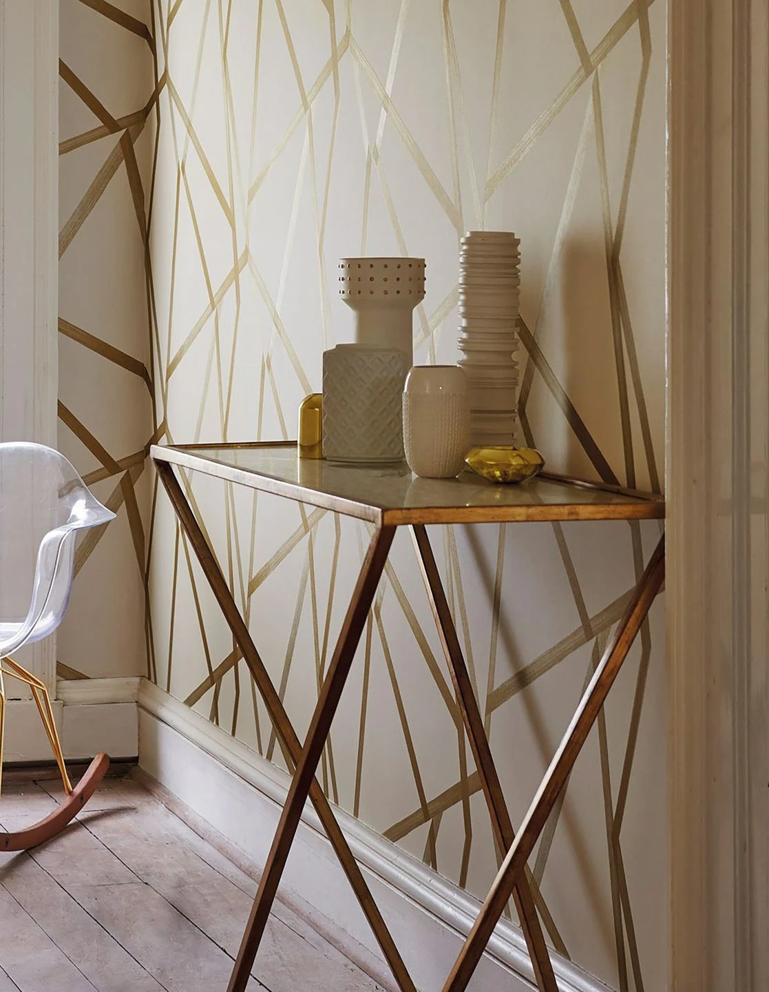 Gerade Bänder in luxuriösem Perlgold, wie mit dem Pinsel gezogen, bilden eine abstrakte geometrische Struktur auf dem schimmernden cremeweißen Untergrund. Wie zufällig treffen und kreuzen sich die Bänder und schaffen eine Vielzahl unterschiedlich geformter Flächen. Die Helligkeitsverläufe, wie sie beim Führen des Pinsels entstehen, suggerieren räumliche Tiefe und sorgen für eine faszinierende und edle Raumwirkung.