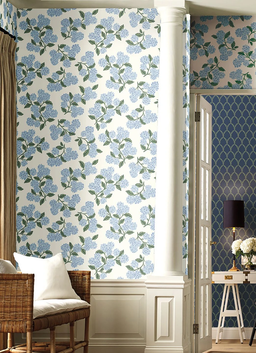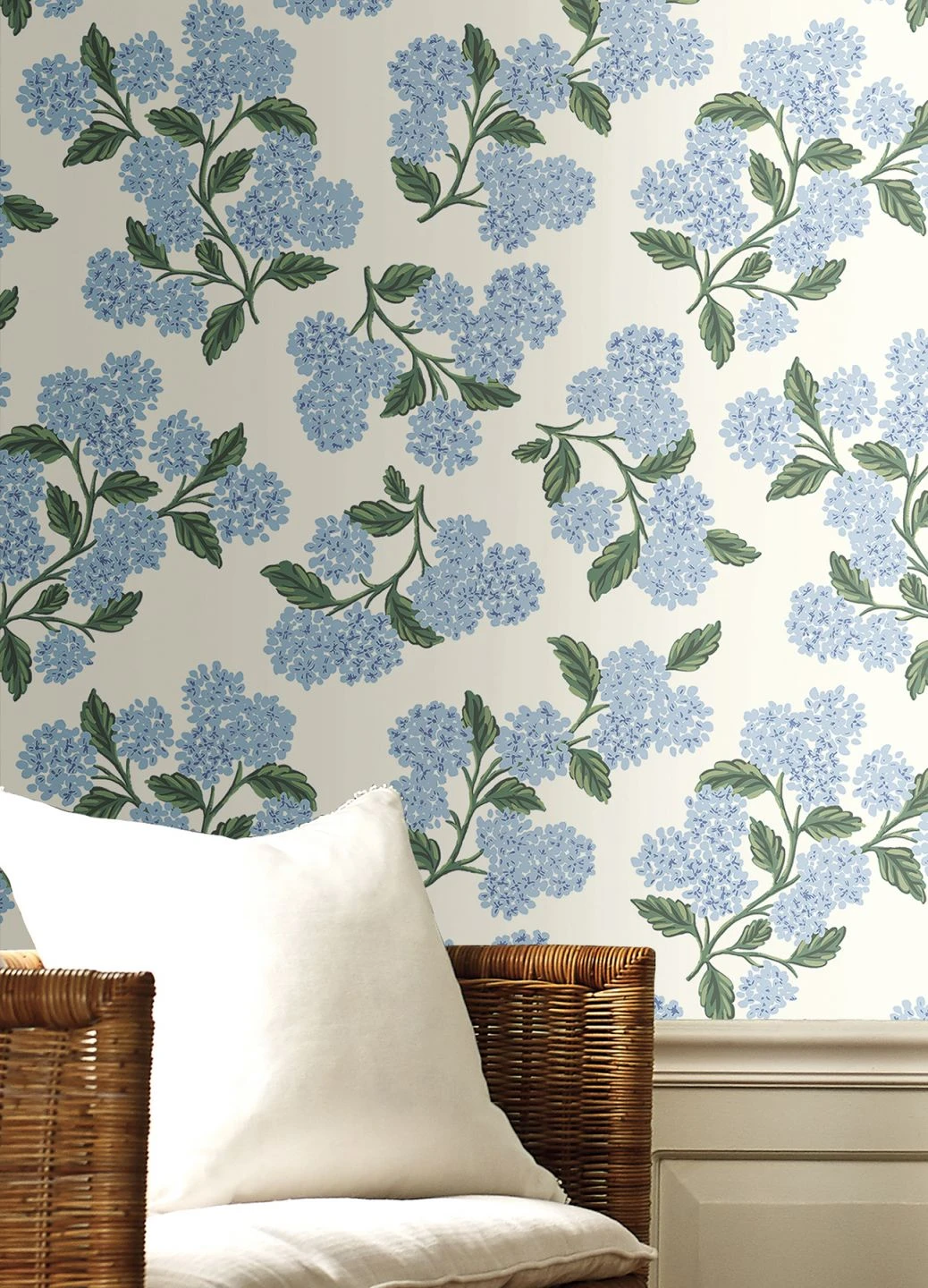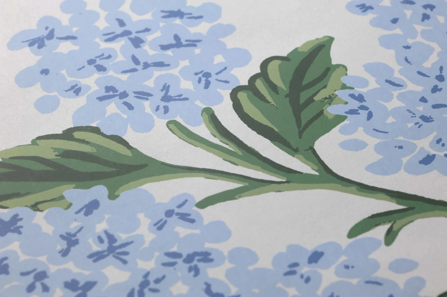 Mit dieser Vliestapete in hellen, zarten Farben laden Sie Licht und Luft in Ihre Räume ein. Die unvergleichlichen Blüten der Hortensie haben für das Design Pate gestanden. Ihr helles Blau mit weißen Highlights und die verschiedene Grüntöne der Blätter lassen die Blumen fast plastisch wirken und sorgen in Verbindung mit dem weißen Hintergrund für sommerliche Frische.