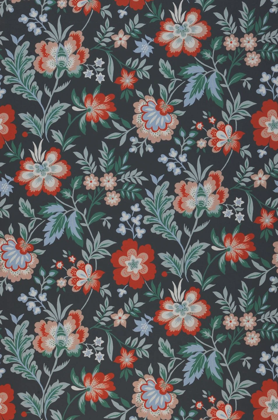 Wie große Hibiskusblüten wirken die stilisierten Blumen, die im Mittelpunkt dieser floralen Tapete stehen. Das Rosé und Rot ihrer Blütenblätter wird von kleineren Blumen und Blättern in Grün und Pastellblau begleitet. Die ausladenden Formen der Blüten erinnern an Ornamente aus der orientalischen Kunst. Auf dem anthrazitfarbenen Hintergrund der Vliestapete entwickeln die Farben des Musters eine intensive Leuchtkraft.