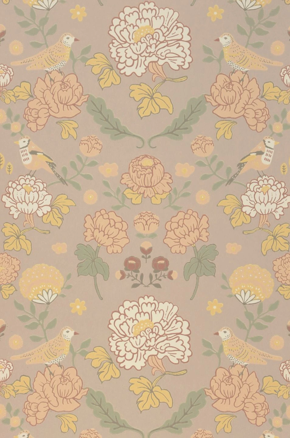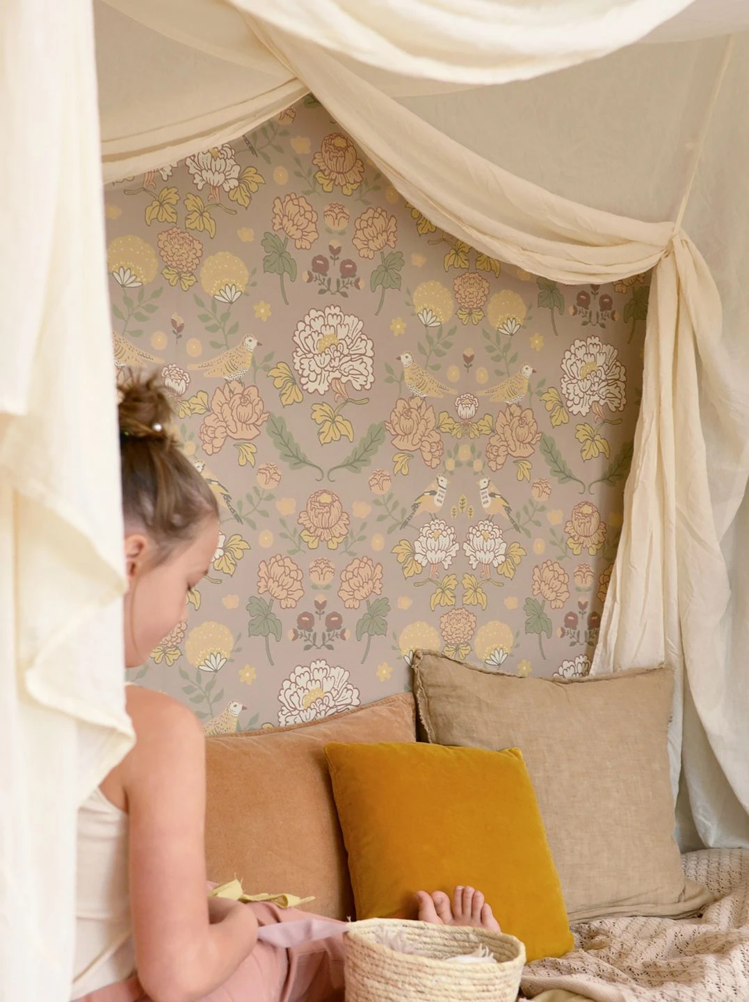 Große und kleine Blumen, Vögel und Blattranken in ruhigen, hellen Grün-, Orange- und Brauntönen auf dem hellgraubeigefarbenen Grund bringen wohldosierte Romantik in ein freundliches Kinderzimmer – ganz ohne dabei kitschig zu wirken. Mit der symmetrischen Anordnung der Motive verströmt „June“ Lebendigkeit und Ruhe zugleich. Die ästhetische Kinderzimmertapete stammt aus dem schwedischen Hause Majvillan und wurde im Leimdruckverfahren hergestellt.