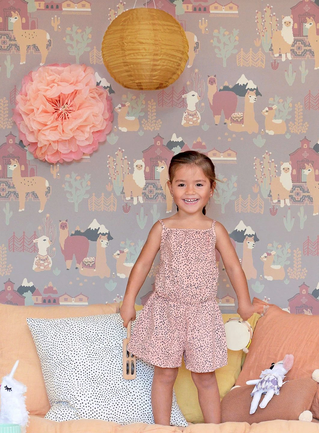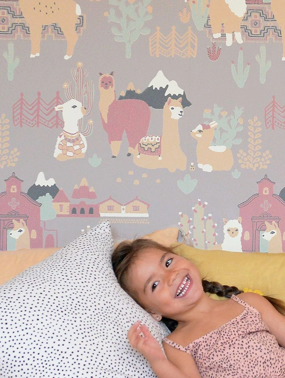 Große und kleine Lamas mit ihren freundlichen Gesichtern und dem kuscheligen Fell bevölkern diese tolle Kinderzimmertapete von Majvillan. In verschiedenen kleinen Szenen nimmt die Tapete die Bewohner des Zimmers mit auf eine abenteuerliche Reise in die südamerikanische Heimat der Tiere. Die hellen Farbtöne – Rotviolett und Blassorange, Blassgrün und Anthrazit auf neutralem grauviolettem Grund – machen das Kinderzimmer zu einem fröhlichen, interessanten Ort.