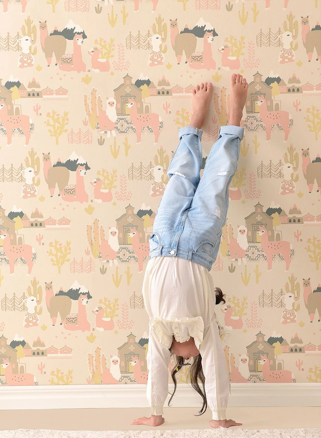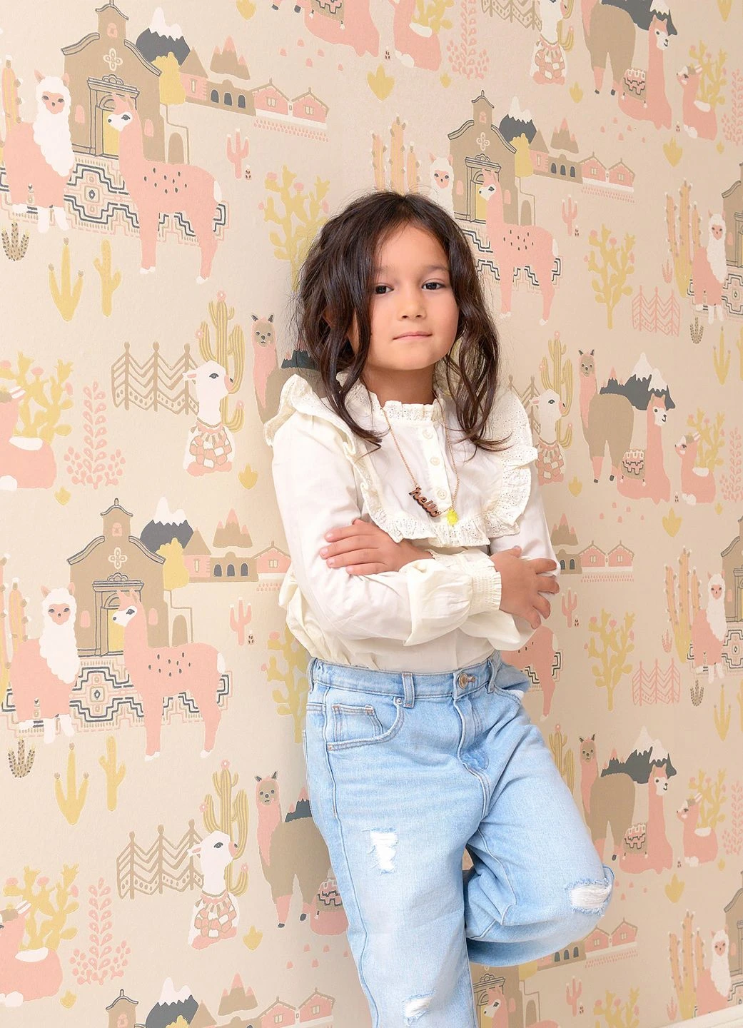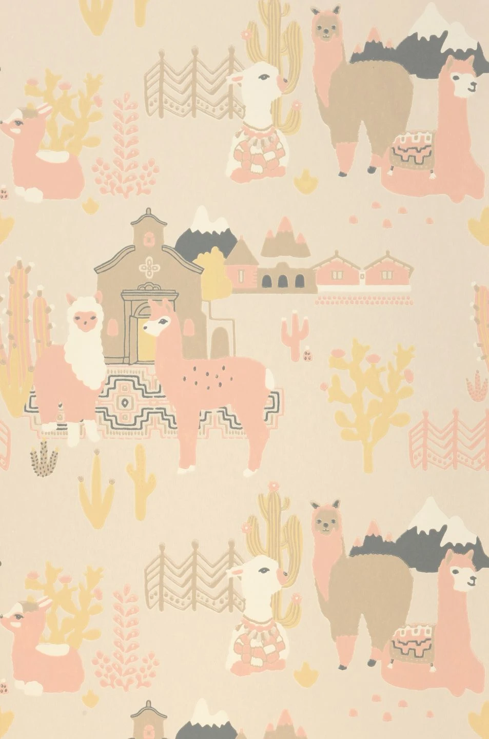 Freundliche, kuschelweiche Lamas in zarten Pastellrosa- und Beigetönen stehen hier im Mittelpunkt. Im Leimdruckverfahren hat der schwedische Hersteller Majvillan die Vliestapete mit Szenen aus der Heimat der südamerikanischen Nutztiere bebildert. So nimmt die Kinderzimmertapete den Betrachter mit auf eine spannende Erkundungsreise in die Welt der Lamas zwischen Kakteen und schneebedeckten Bergen.