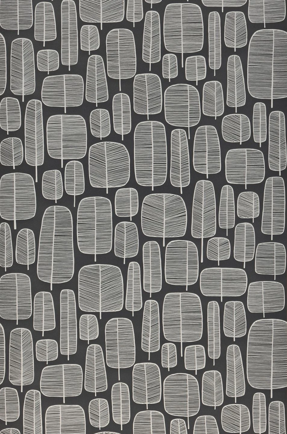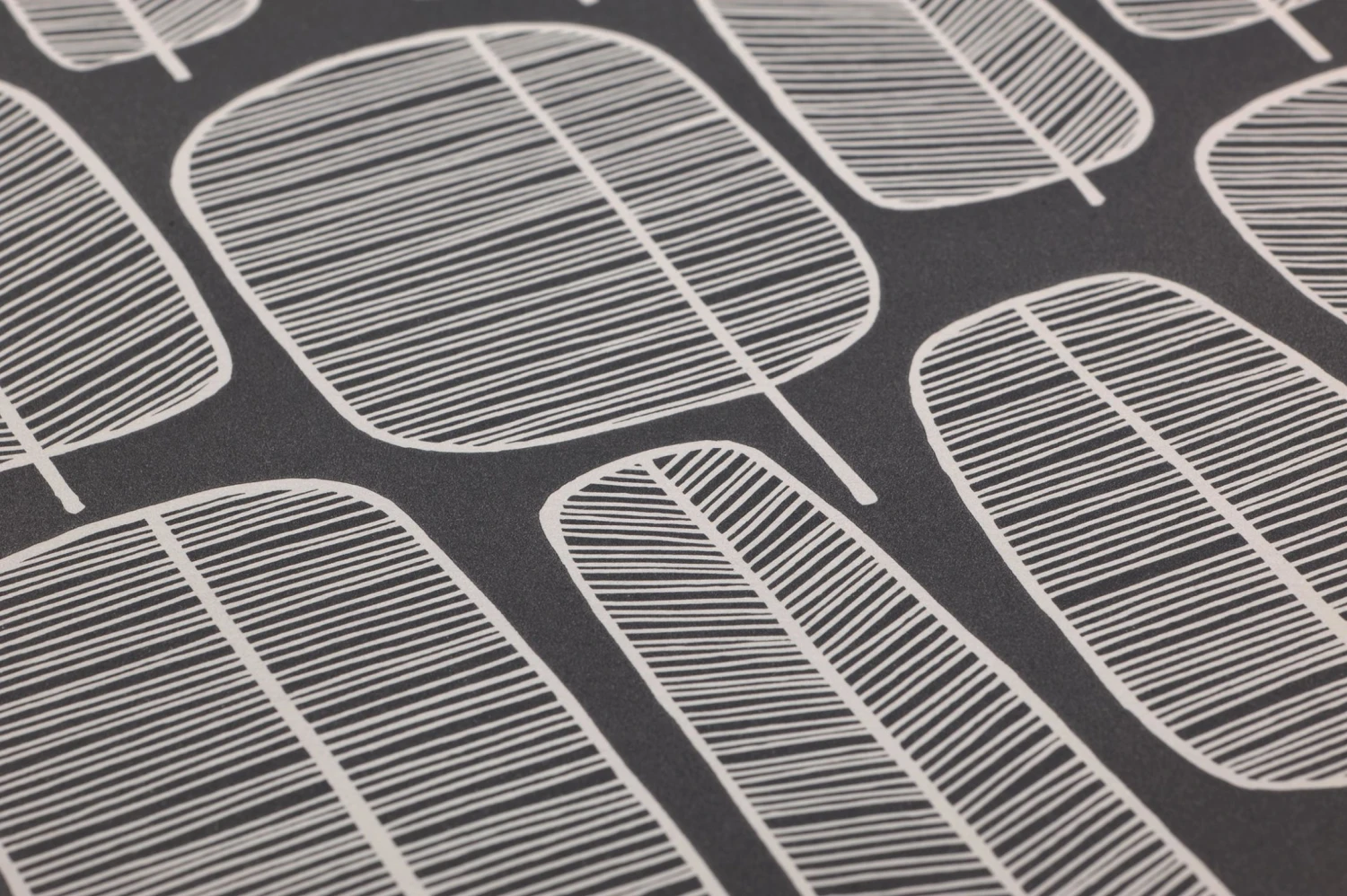 Das Große wiederholt sich im Kleinen – die Vliestapete illustriert diesen Satz auf besondere Weise. Die durch zarte Schraffur und einfache Umrisse angedeuteten Bäume mit ihren vielfältigen Formen könnten auch einzelne Blätter mit filigranen Blattadern und Rippen sein. Durch die weißen Schraffuren und Linien auf Anthrazitgrau mutet die außergewöhnliche Tapete wie ein Schwarzweiß-Negativ an.