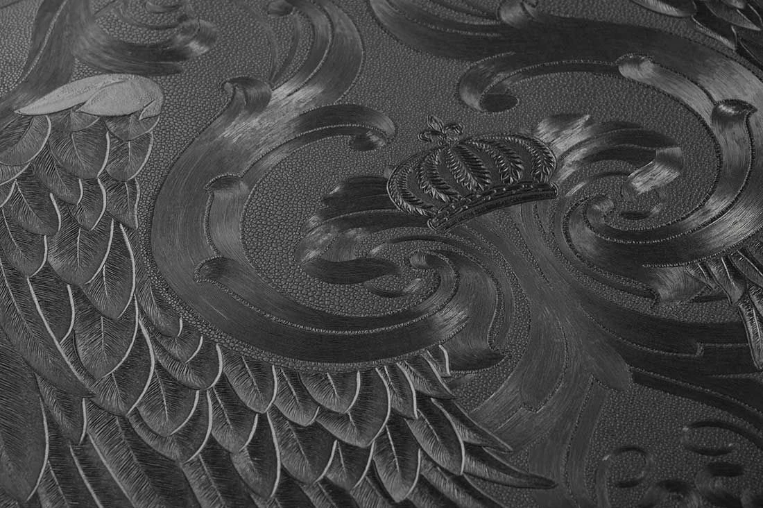 Glamourös und mysteriös zugleich wirken die Kronen und Engelsflügel der schwarzen Tapete Morrigan. Die feine Prägung der Vinyl-Oberfläche erinnert an die Gravur eines luxuriösen Schmuckstücks.