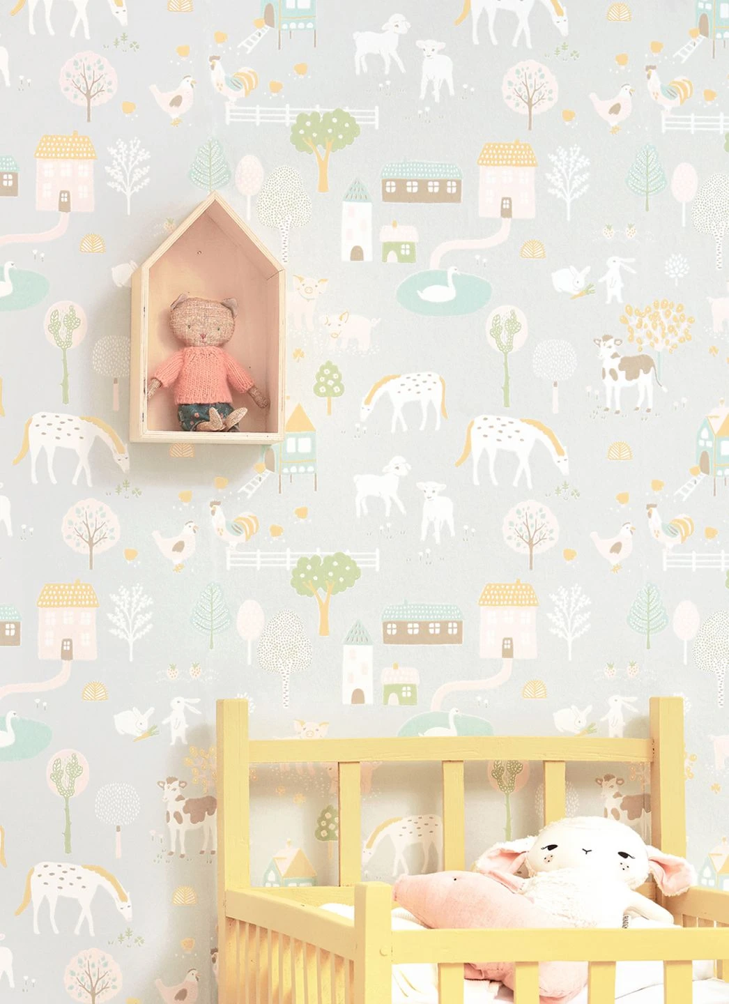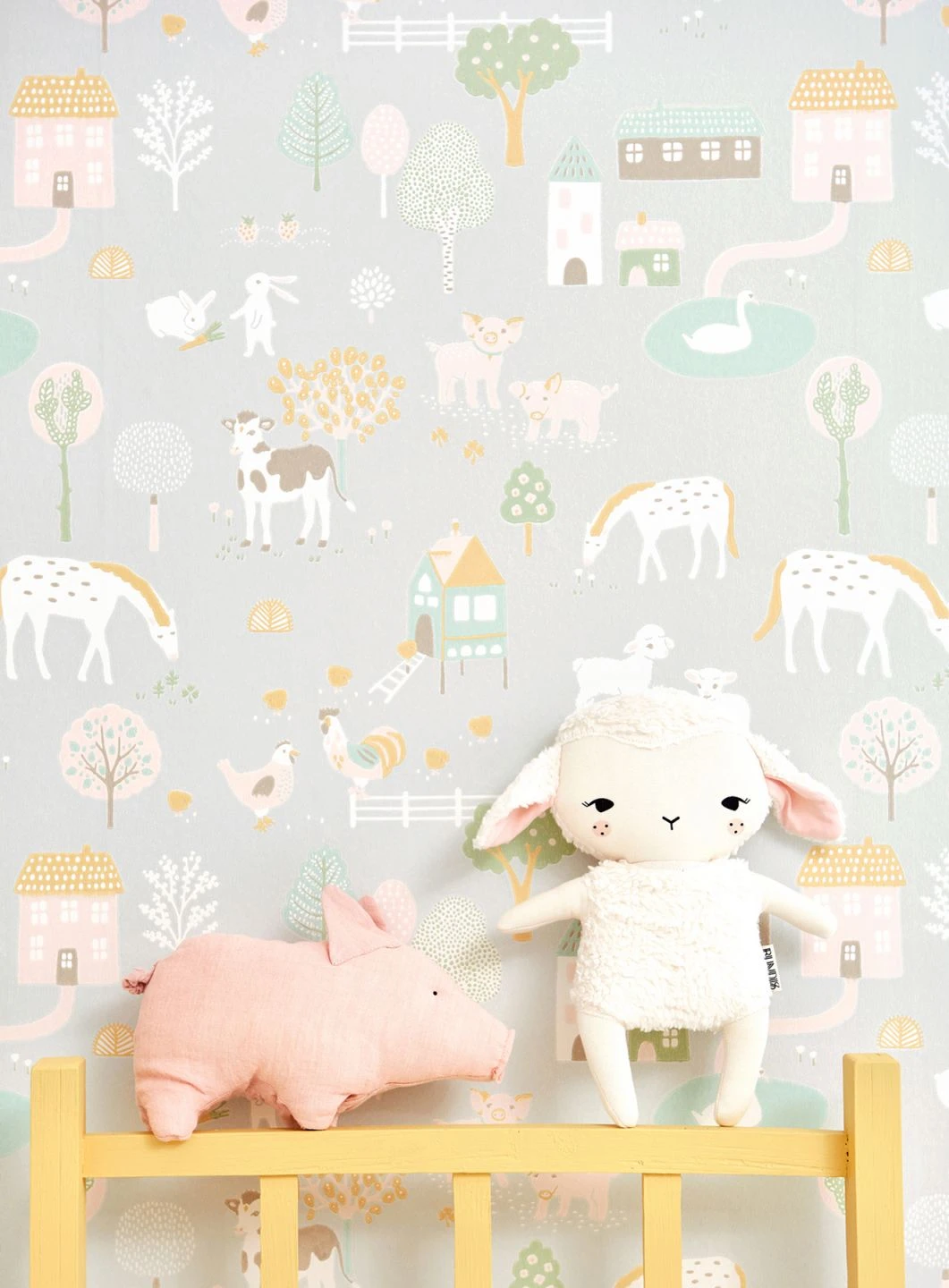 Wie auf einem richtigen Bauernhof gibt es auf dieser Kindertapete aus dem Hause Majvillan viel zu entdecken: Kühe und Pferde, Schweine, Kaninchen und Hühner, Lämmer und sogar Schwäne tummeln sich liebevoll gezeichnet zwischen den Hofgebäuden und den blühenden Bäumen. Das kindgerechte Design und die zarten Farben auf weißgrauem Untergrund sorgen für eine helle, freundliche Stimmung im Kinderzimmer.