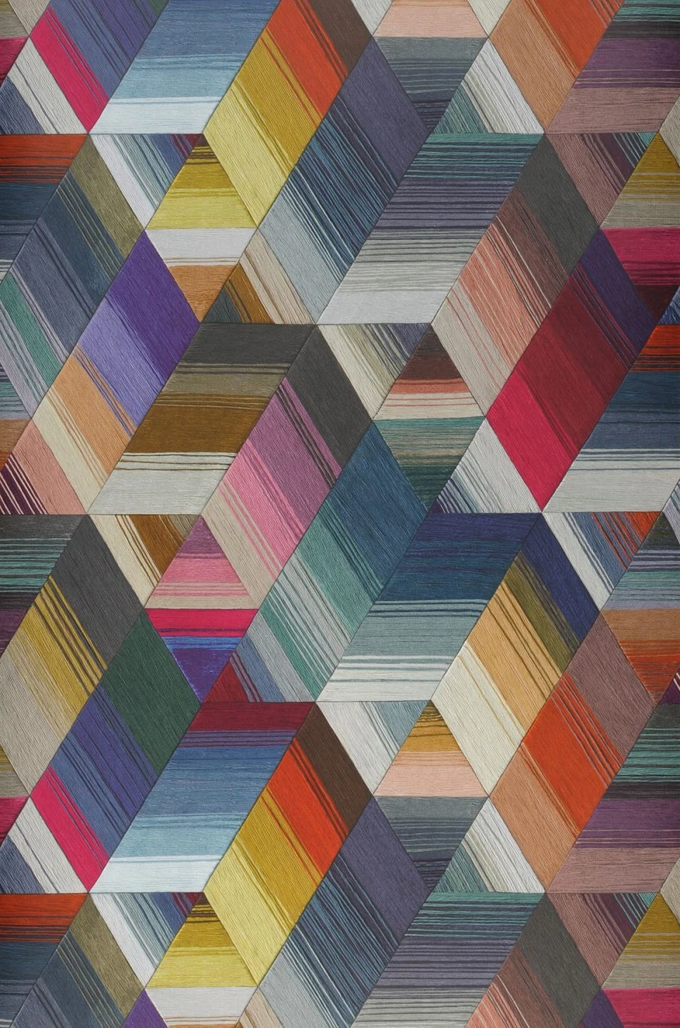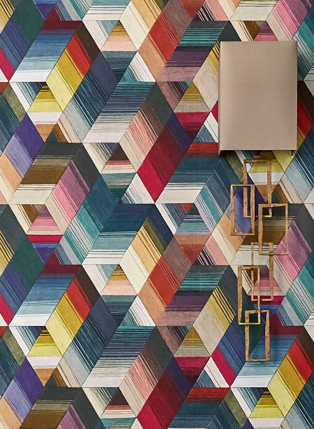 Die Illusion dreidimensionaler Formen entsteht im ausgeklügelten Design dieser Tapete. Aus Linien und Streifen kräftiger, bunter Farben setzen sich Dreiecke und Trapeze zusammen. Die geschickte Anordnung der farbigen Streifen und der Oberflächenstruktur schafft den Eindruck von Tiefe. Die farbenfrohe Vliestapete macht Ihre Wand zu einem interessanten Einrichtungselement und lässt sich mit dem ganzen Spektrum der verwendeten Farbtöne ideal kombinieren.