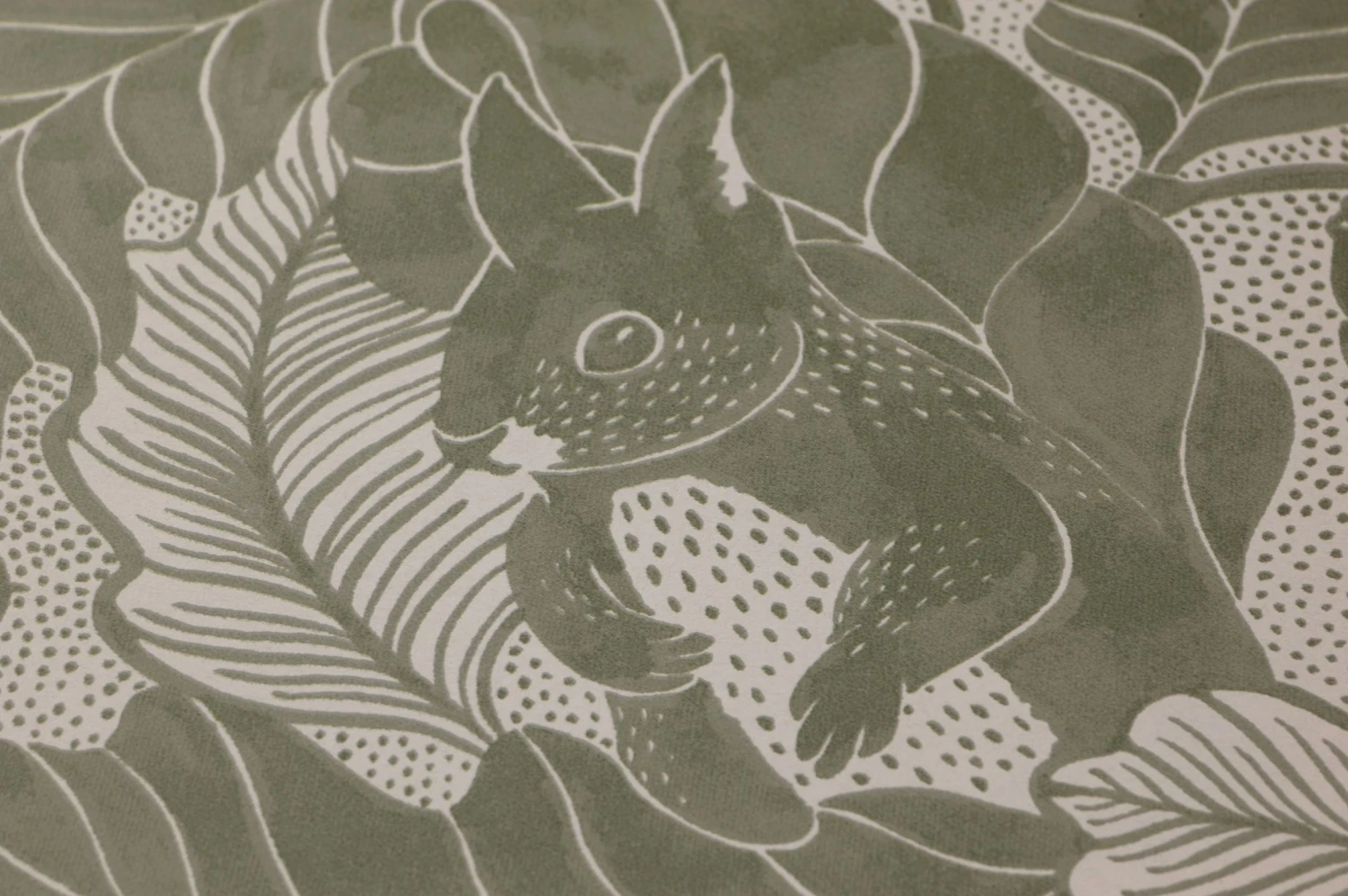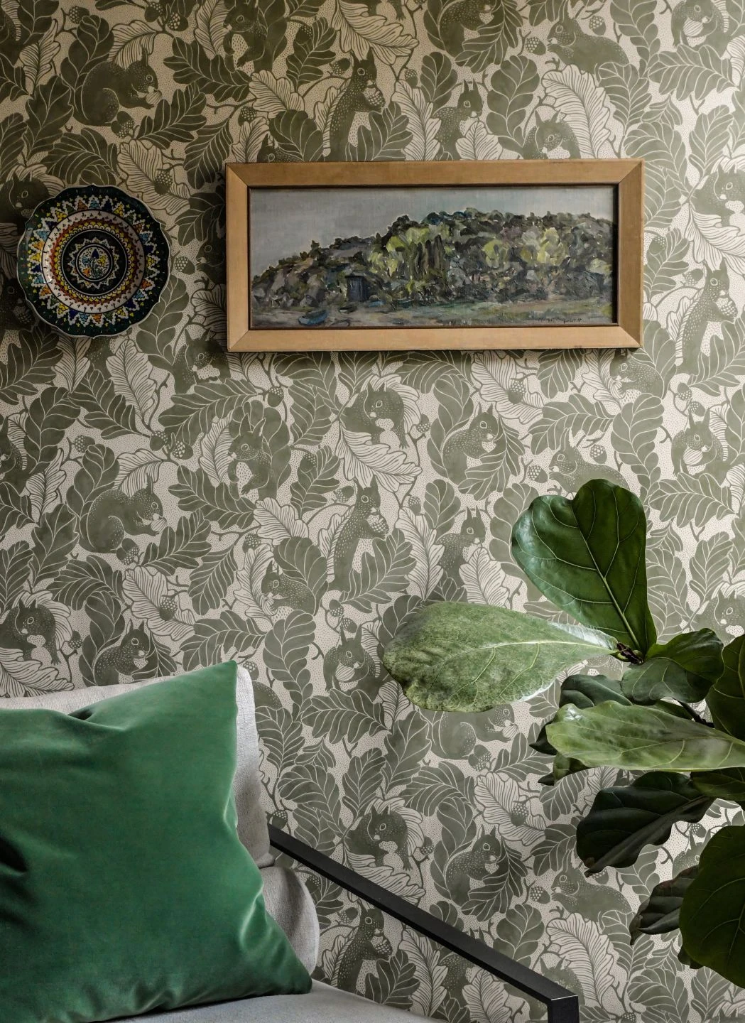 Eichhörnchen verstecken sich in den Zweigen der Eichen. Die Darstellung des Tapetenmusters trägt ihr Teil zu ihrer Tarnung bei: Durch die Konzentration auf ein blasses Olivgrün als Musterfarbe und durch die Form ihrer buschigen Schwänze, die von den Eichenblättern kaum zu unterscheiden sind, laden sie den Betrachter zu einem kleinen Suchspiel ein. In Verbindung mit Holzmöbeln im skandinavischen oder Vintage-Stil ist Oak Tree Tails ein besonders schöner Hintergrund für Ihren Raum.
