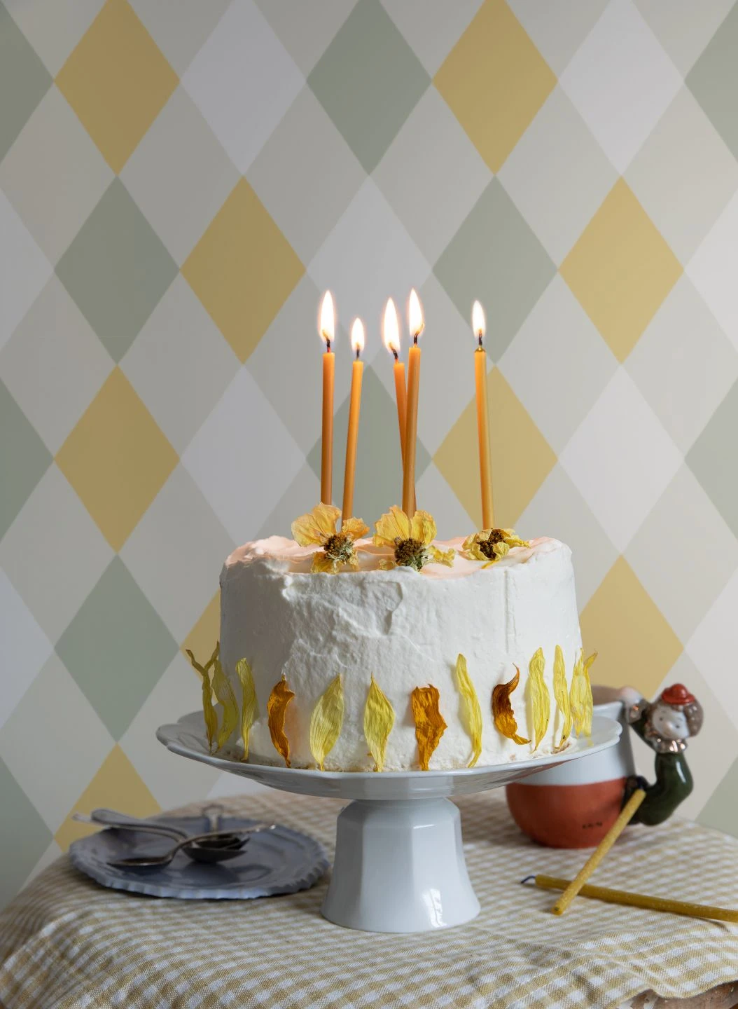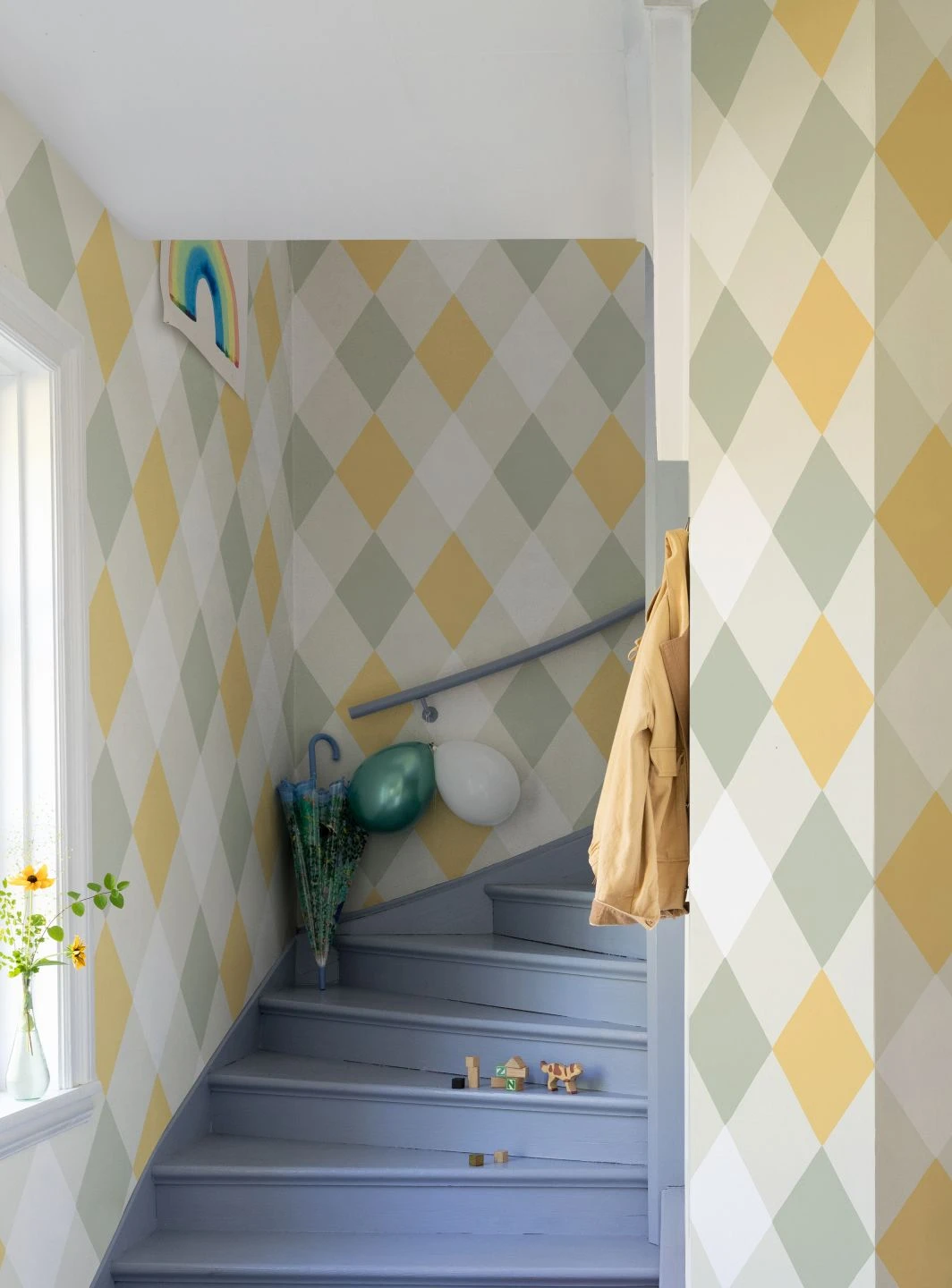 Das klassische, großflächige Karomuster erhält durch die Kombination von Hellgelb, Weiß und verschiedenen Grautönen einen Ausdruck von Frische und Lebendigkeit. Das Design macht Ihre Wände zu einem Hingucker, mit dem Sie den skandinavischen Stil ebenso schick unterstreichen wie Shabby Chic oder Vintage-Stil. Besonders reizvoll passt sich die geometrische Formgebung der schlanken Rauten übrigens auch einem Treppenaufgang an.