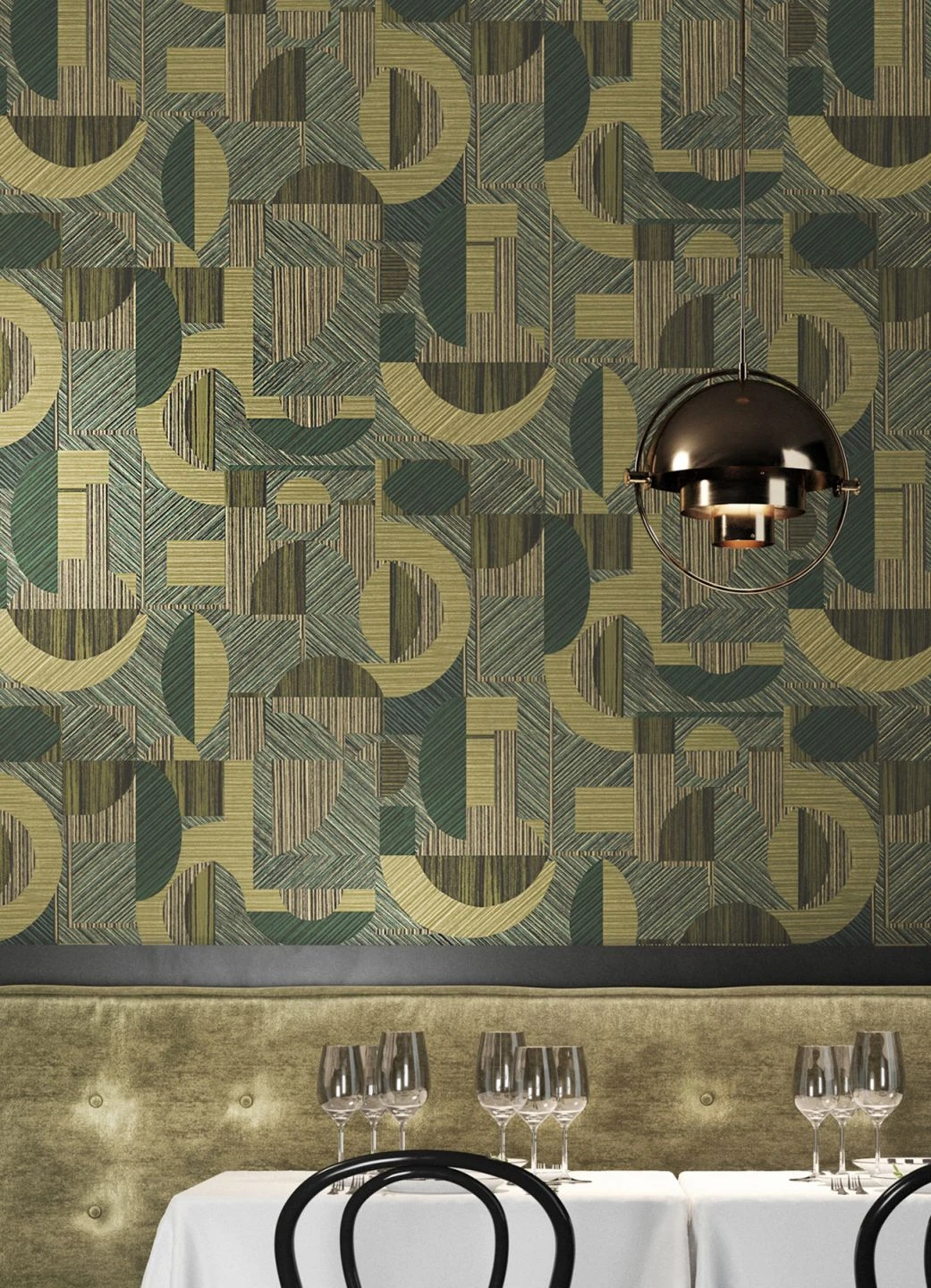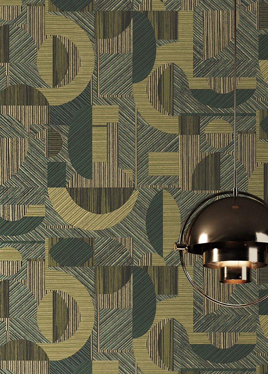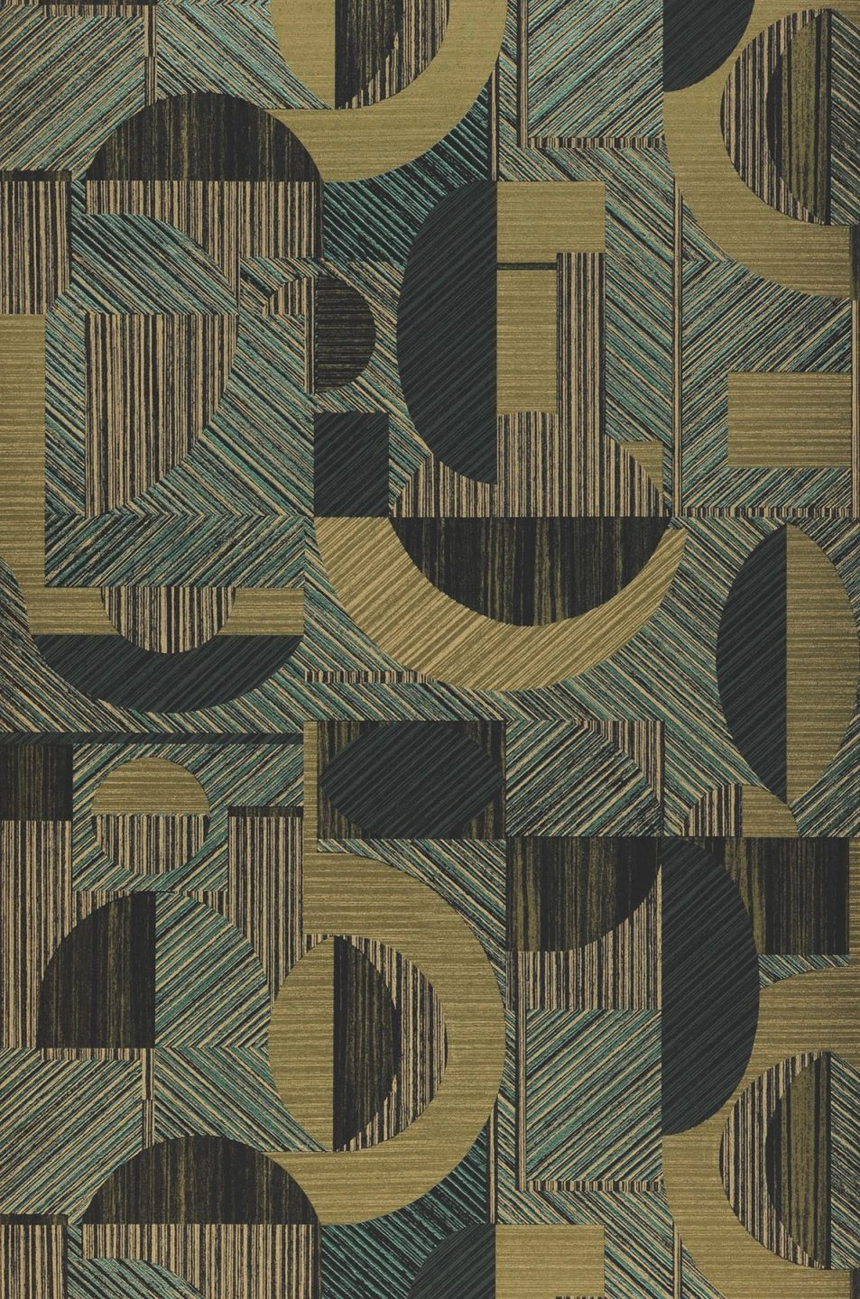 Aus der Kombination von schimmerndem Opal- und Schilfgrün mit Beige und Schwarz und durch raffinierte Schraffuren in verschiedener Ausrichtung ergeben sich vielfältige geometrische Formen. In Halbkreisen und Kreissegmenten, Bögen und Rechtecken entsteht ein lebendiges Zusammenspiel fast wie der Blick über die verschiedensten Dachformen einer urbanen Skyline.