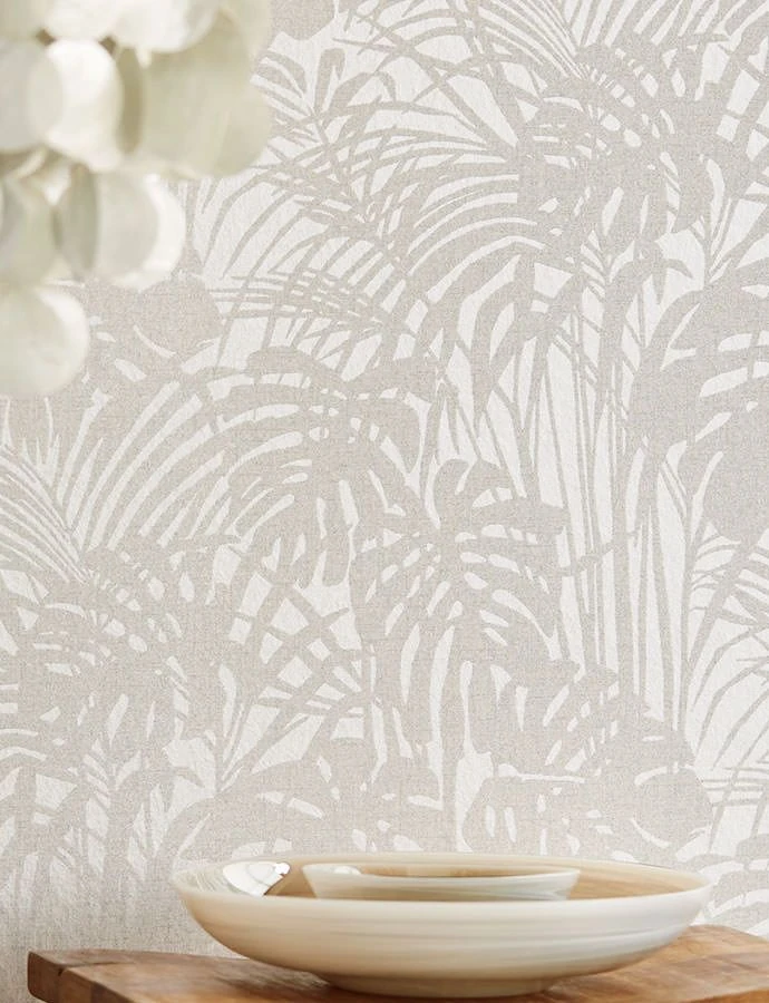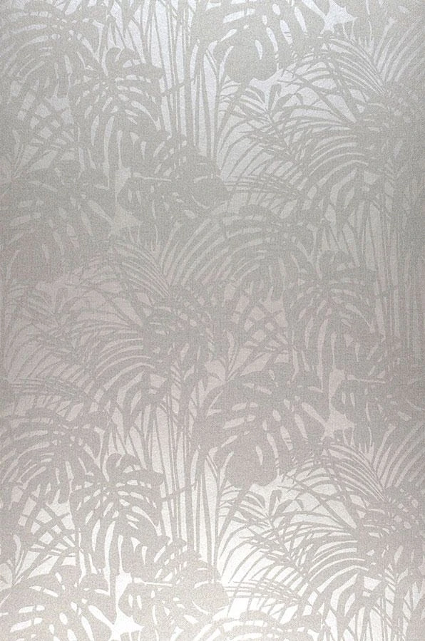 Grauweiss und Silbergrau Glitzer bilden die Farbwelt ab, in der Luxus Tapete Persephone dem exotischen Glamour die funkelnde Krone aufsetzt. Die Palmzweige sind mit unzähligen Glasperlen besetzt, die glanzvoll im Licht schimmern.
