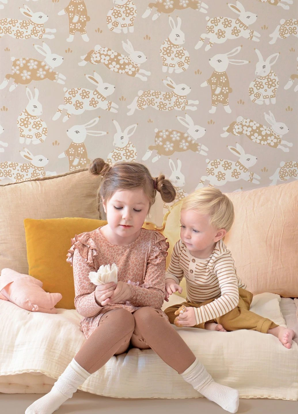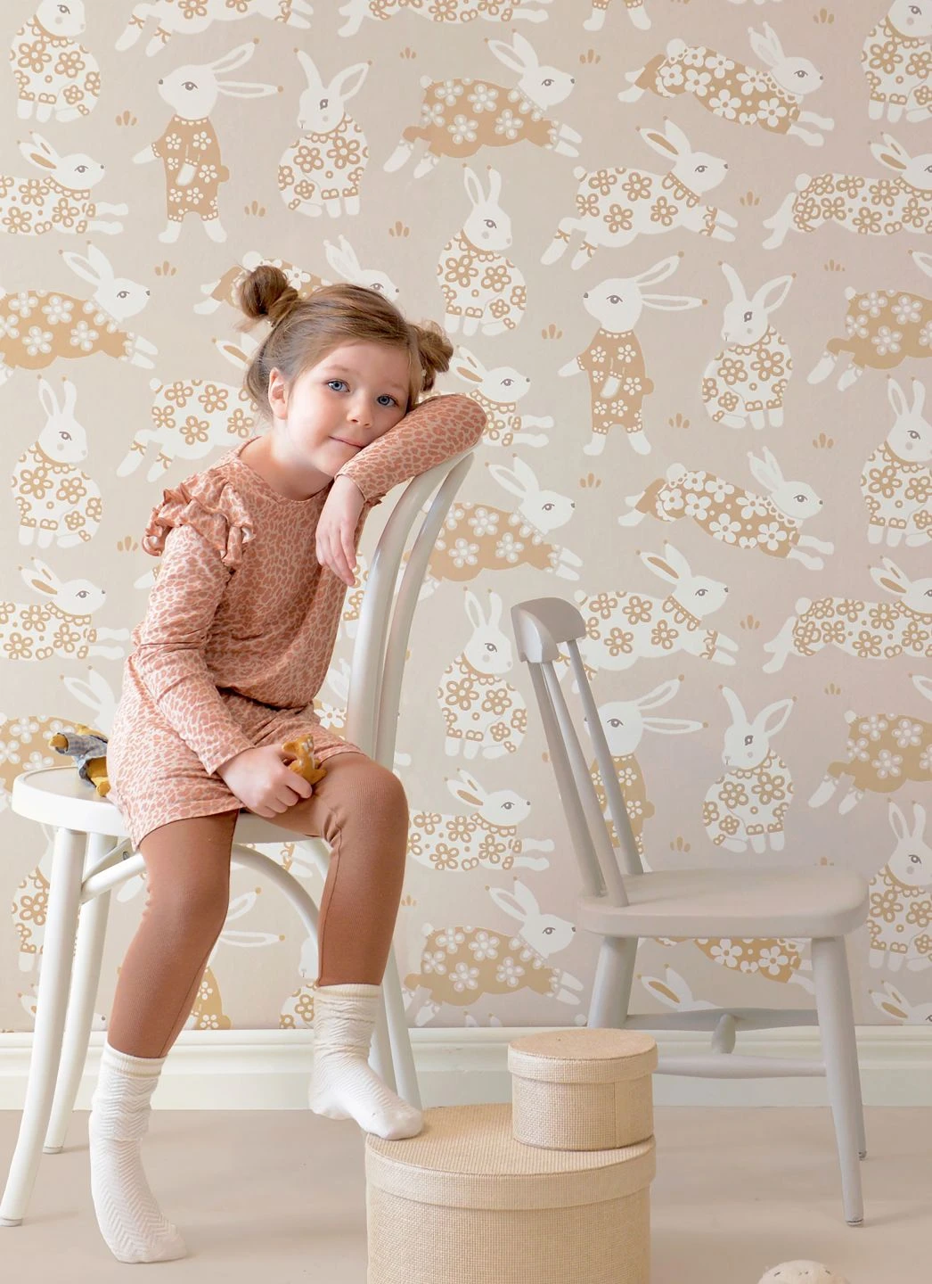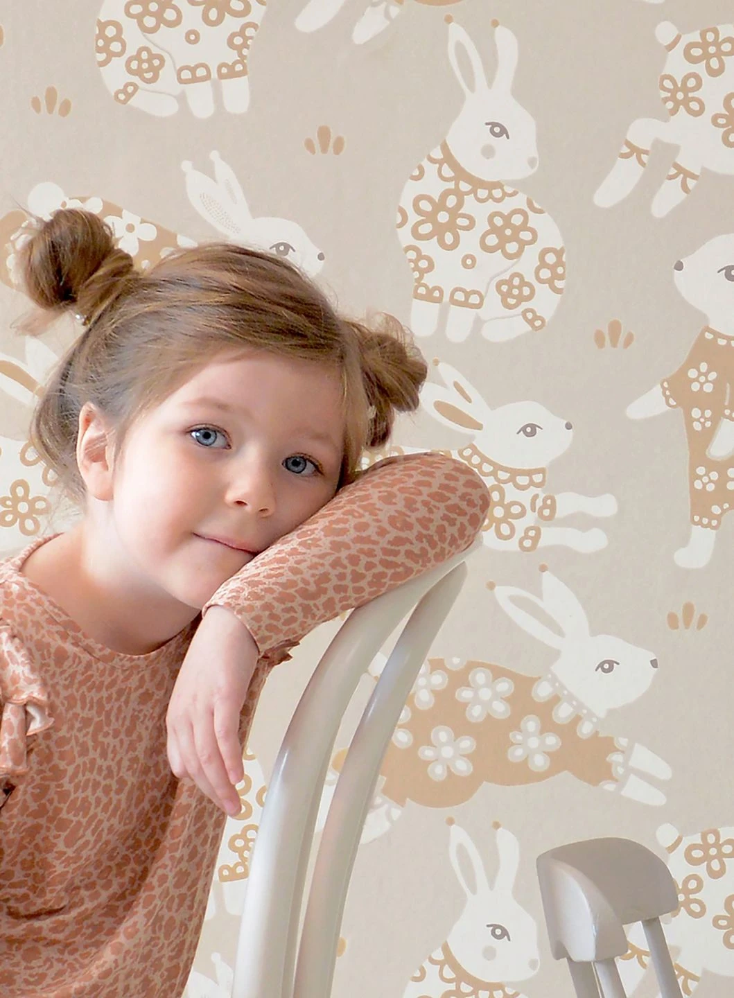 Fröhlich und verspielt hüpfen niedliche Häschen mit blumengemustertem Fell über diese Kinderzimmertapete von Majvillan. Liebevoll gezeichnet wie die Illustrationen in einem Kinderbuch, begleiten sie die kleinen Bewohner des Zimmers beim Spielen und Lernen. Die harmonisch zusammengestellten Farben – Braunbeige und Cremeweiß auf hellgraubeigefarbenem Grund – geben dem lebhaften Muster ästhetischen Zusammenhalt.