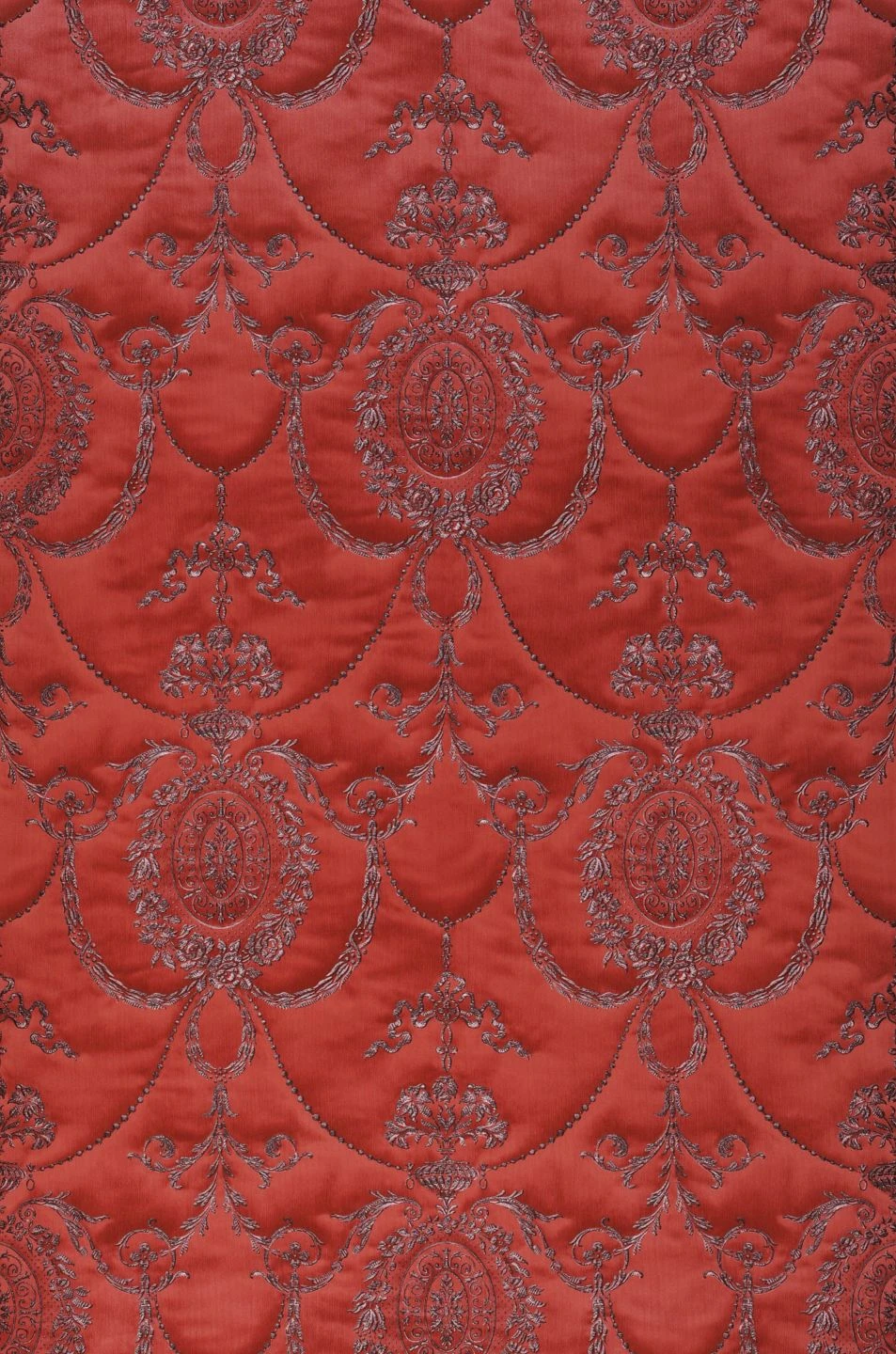 Royales Purpurrot – eine wahrhaftig königliche Farbe! Und wie in einem Palast wirkt Ihr Raum mit der barocken Tapete Rabia, die sehr überzeugend einen textilen Wandschmuck nachahmt: Zwischen den echt wirkenden Stickereien, die in das Vinyl der Oberfläche als feines Relief eingeprägt sind, wölbt sich der leicht schimmernde Stoff hervor. Würdigen Sie die höfische, historische Ausstrahlung von Rabia mit dunklen antiken Möbeln für einen außergewöhnlichen Raumeindruck.