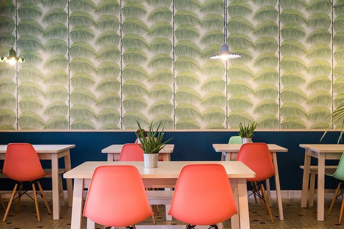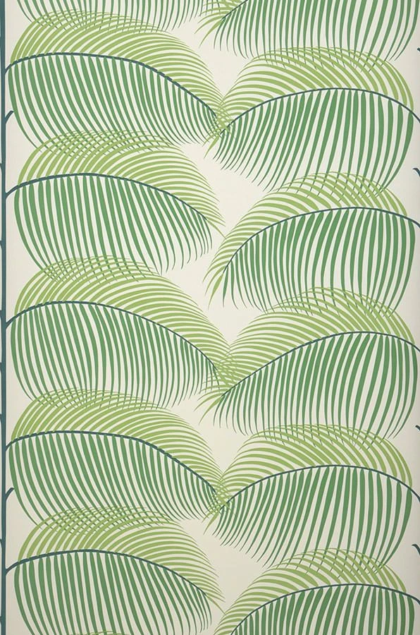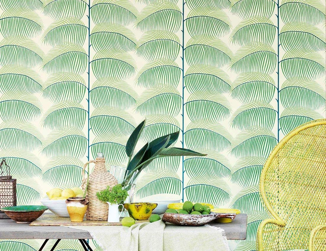 Geradlinig verlaufen die grünen Palmenzweige auf weißem Untergrund, doch man kann beim Betrachten einen kleinen Windhauch spüren. So wird Ihr Esszimmer zur sonnigen Freiluftoase.