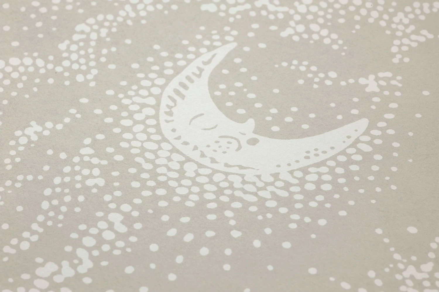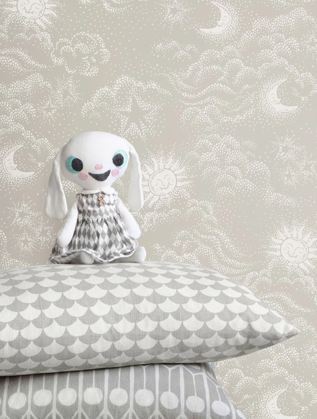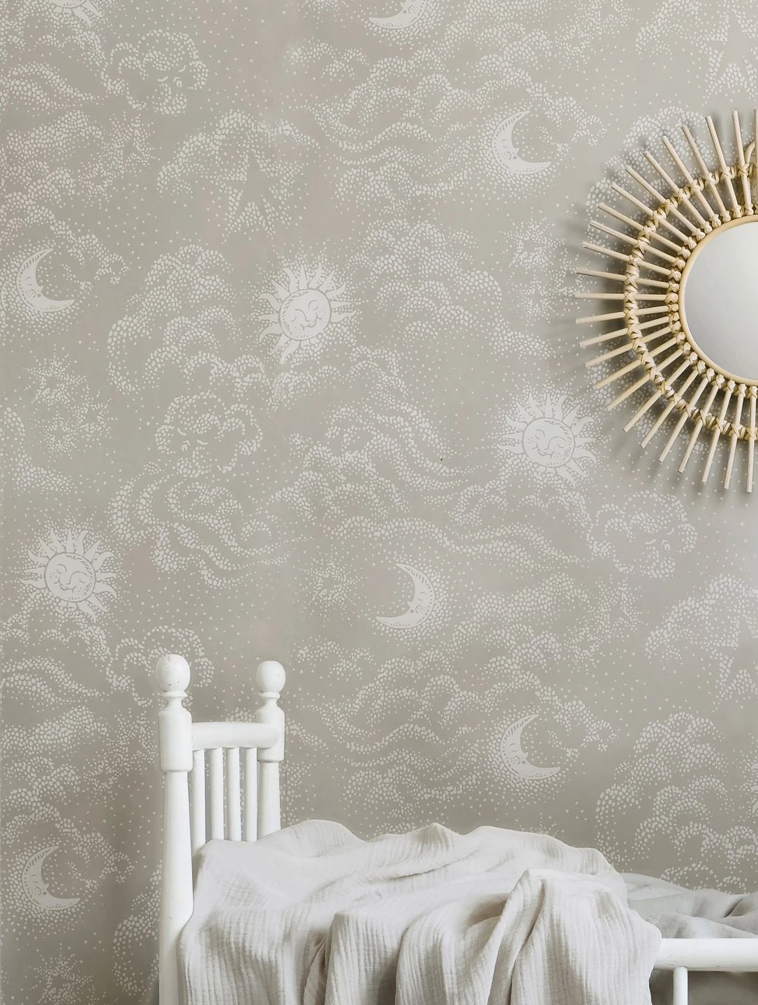 Die Sonne blickt lächelnd auf die Erde herab. Der Mond macht ein Nickerchen auf einer Wolke. Eine andere Wolke pustet mit aufgeblasenen Backen den Wind um die Erde. Der Himmel, der auf der wunderhübschen Kinderzimmertapete Sky Dreams dargestellt ist, ist freundlich und bietet Schutz. Das edel wirkende Seidengrau als Grundfarbe mit dem Grauweiß des Musters macht den Gesamteindruck der Tapete besonders harmonisch.