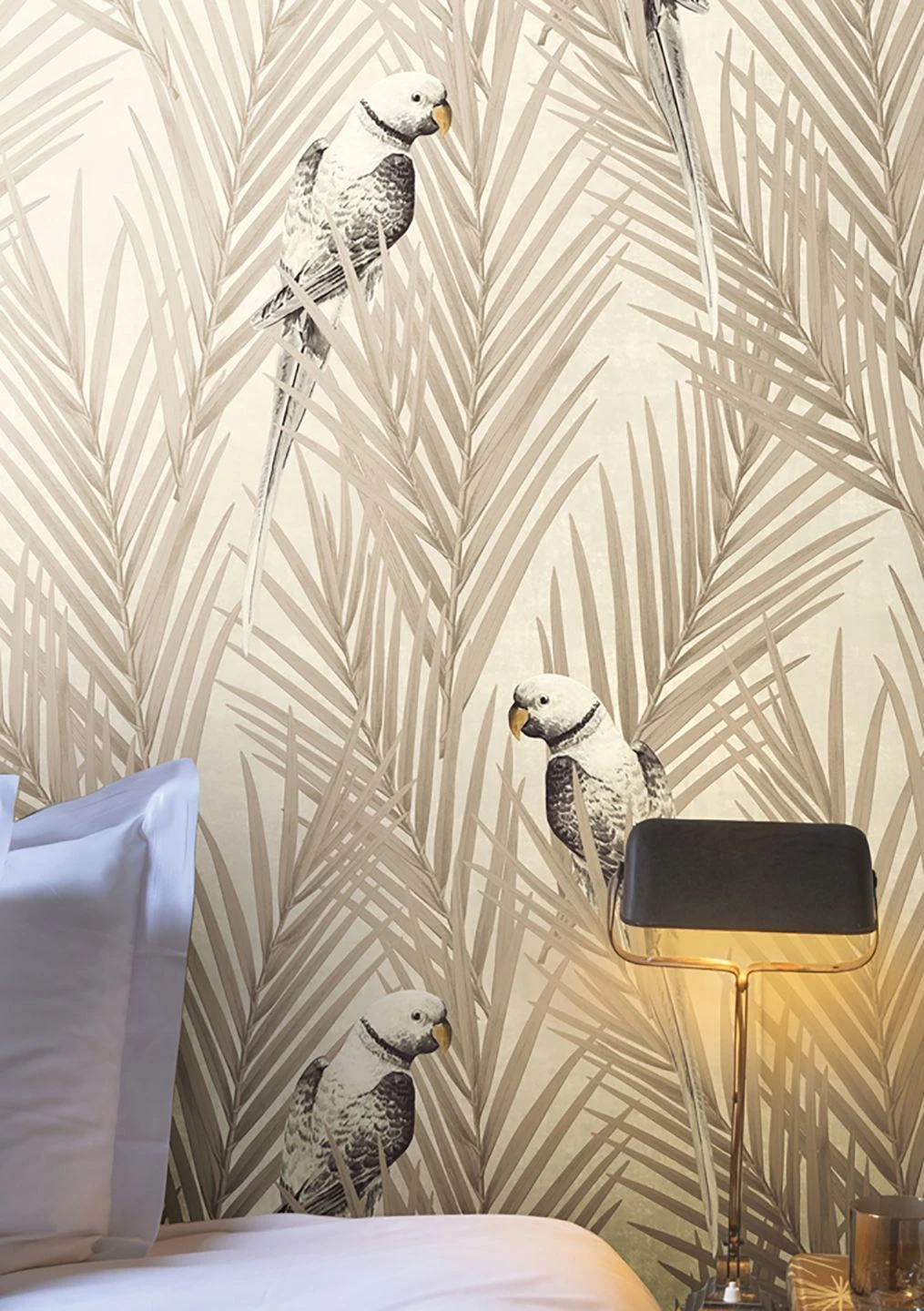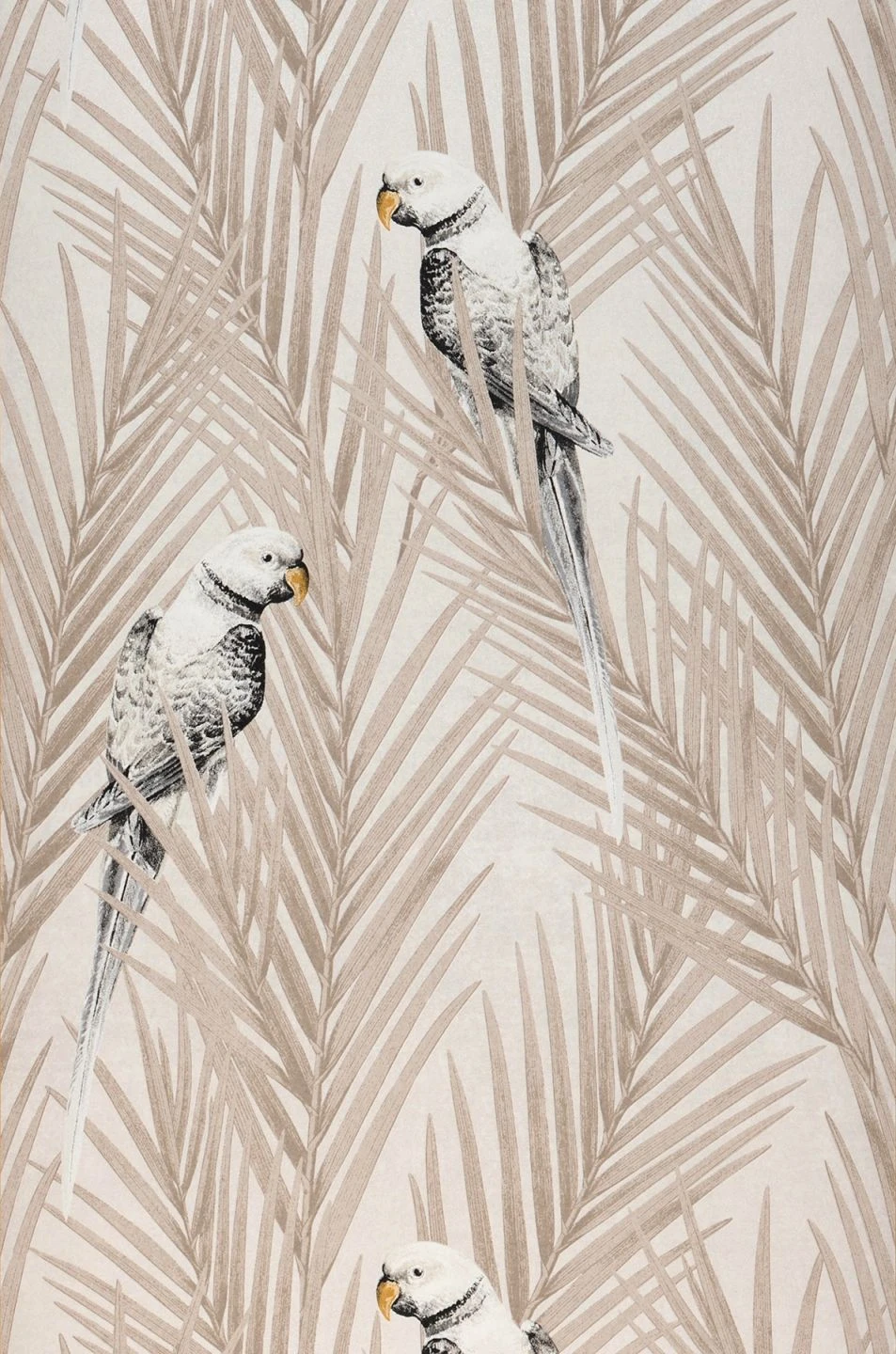 Fast monochrom wirken die Palmblätter und die exotischen Vögel, die in hellem Graubeige, Ockergelb, Weiß und Schwarz auf cremeweißem und schimmernd grauweißem Hintergrund abgebildet sind. Die unaufdringlichen Farben lassen das exotische Motiv wie eine künstlerische Schwarzweißaufnahme wirken. Helle Holztöne passen ebenso gut dazu wie schwarze oder graue Einrichtungselemente.