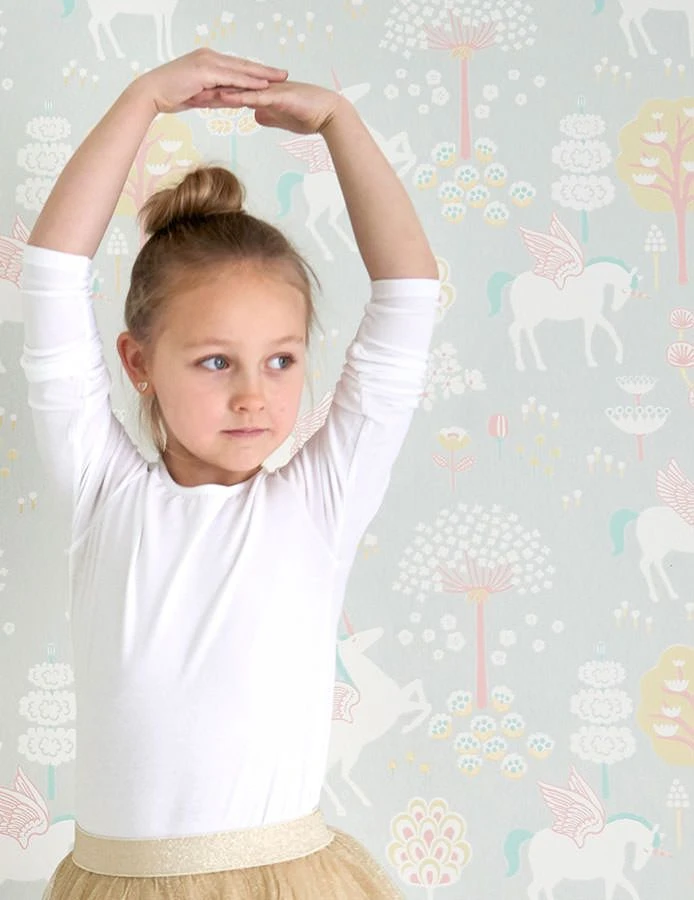 Musterelemente in Altrosa, Cremeweiss, Hellgelb, Pastellgrün und Ocker Schimmer auf feinem Hellgrau ermöglichen Entspannung, Einhorn-Fantasy mit Happy End und beflügelnde Inspiration. Die waschbeständige Kindertapete von Majvillan ist ein herrlicher Wandstoff aus dem Mädchenträume gemacht werden.