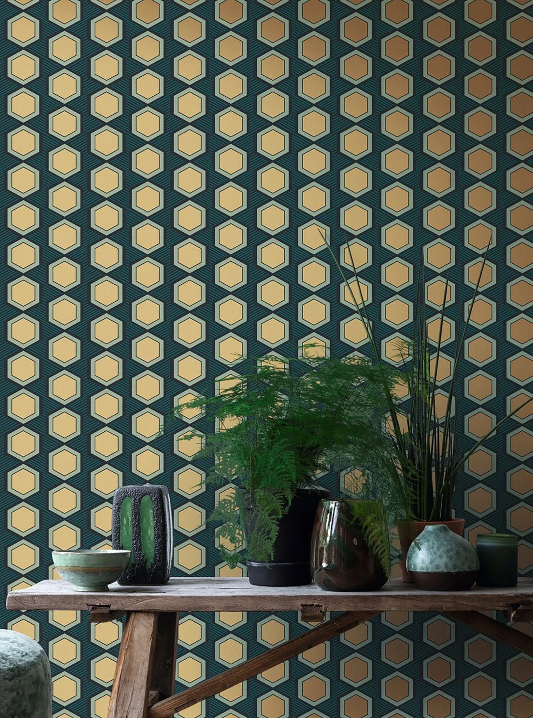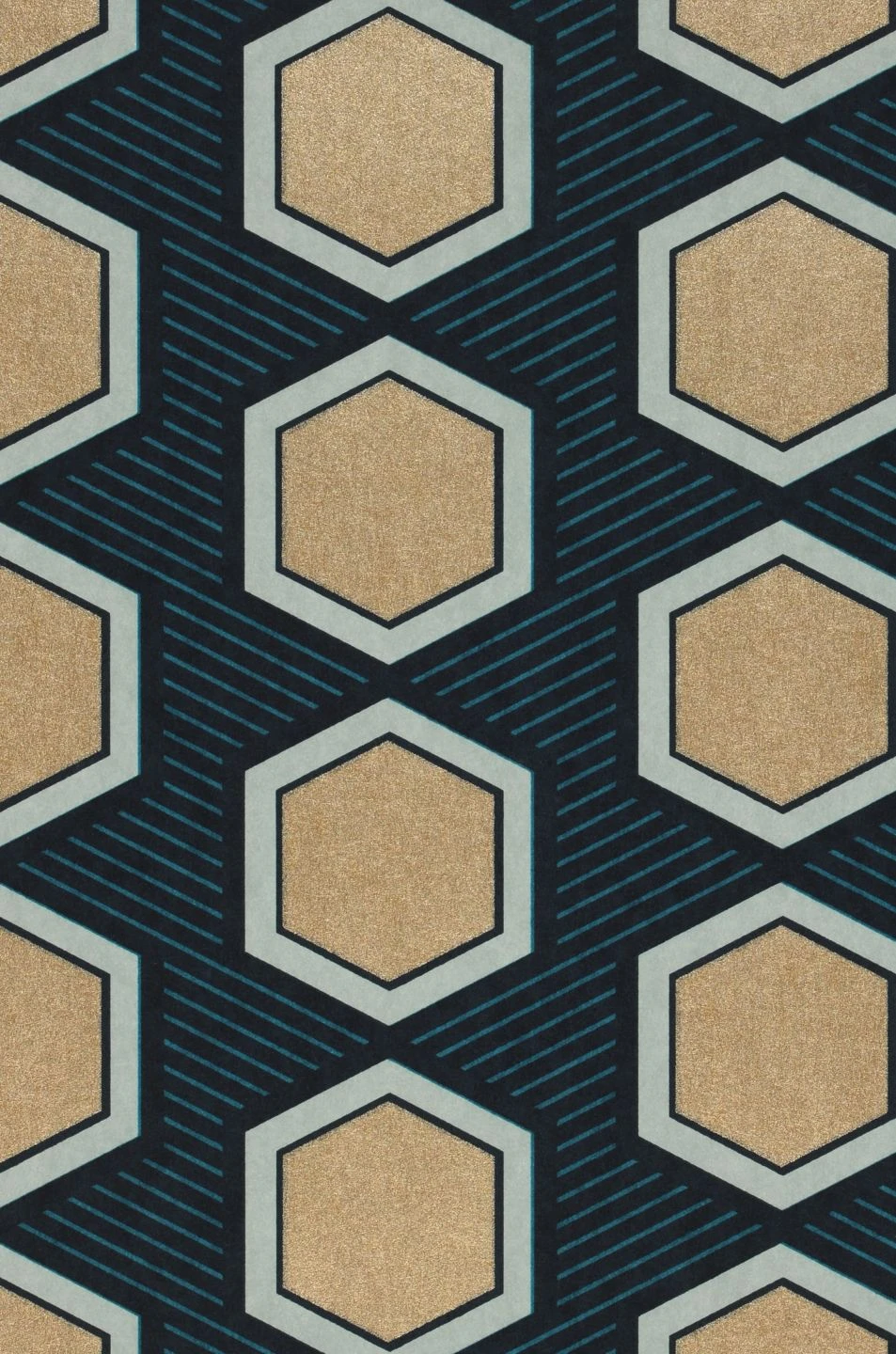 Klare Formen und starke Farben machen die geometrische Tapete Uroko zu einem charaktervollen Gesamtkunstwerk für Ihre Wand. Die Sechsecke in schimmerndem Gelbgold stehen im Mittelpunkt, umgeben von einem zartgrünen Rand und symmetrisch angeordnet auf einem schwarz und türkisblau schraffierten Grund. Die regelmäßige Anordnung des Musters schafft Struktur und Ordnung und betont den luxuriösen Glanz des Goldes.