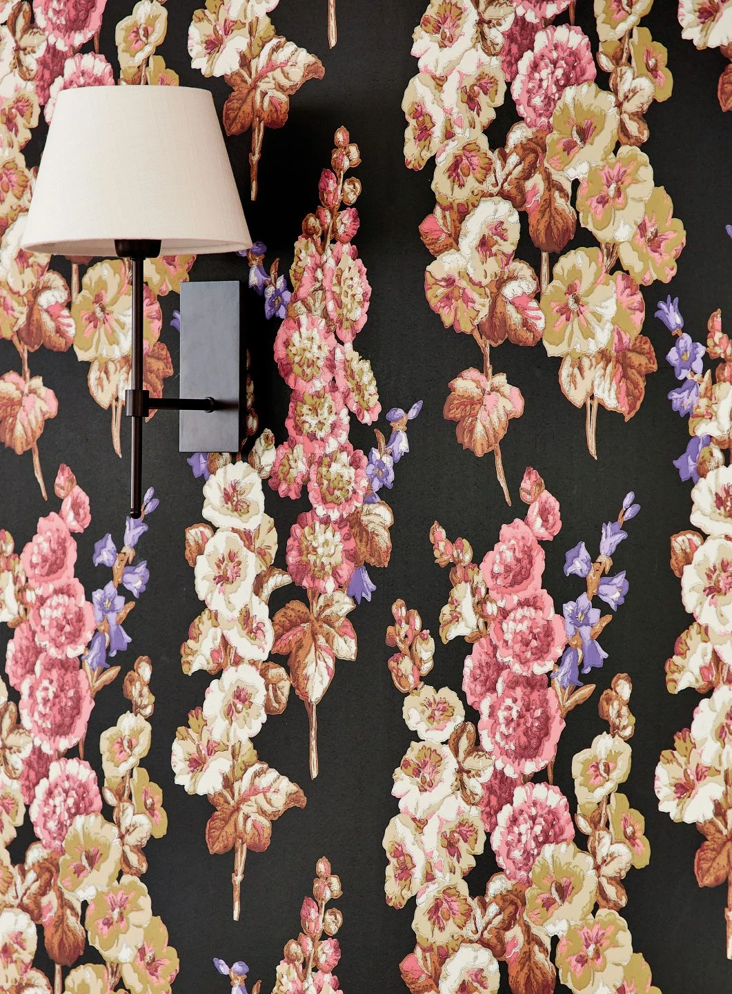 Die schwarze Grundfarbe dieser außergewöhnlichen floralen Tapete lenkt die ganze Aufmerksamkeit auf die leuchtenden Farben der Stockrosen, aus denen sich das elegante Muster zusammensetzt. Die kräftigen Rosa-, Violett-, Gelb- und Beigetöne scheinen auf dem dunklen Grund eine ganz eigene Leuchtkraft zu entwickeln. Besonders kostbar wirkt die Tapete durch das verwendete Leimdruckverfahren, das den Farbauftrag wie handgefertigt erscheinen lässt.
