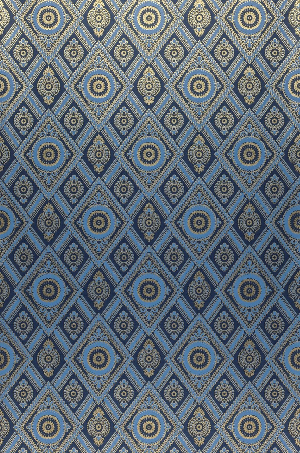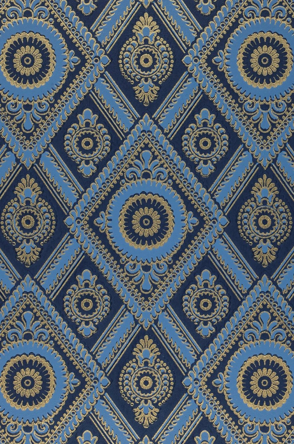 Designtapete William in Kobaltblau, Brillantblau und Gold berührt die Seele mit ihrer unvergleichlichen Schönheit. Kostbar, königlich und eindrücklich präsentiert sich das historisch-geometrische Muster im Stil der britischen Renaissance. Gestalten Sie damit Ihren individuellen blauen Salon!