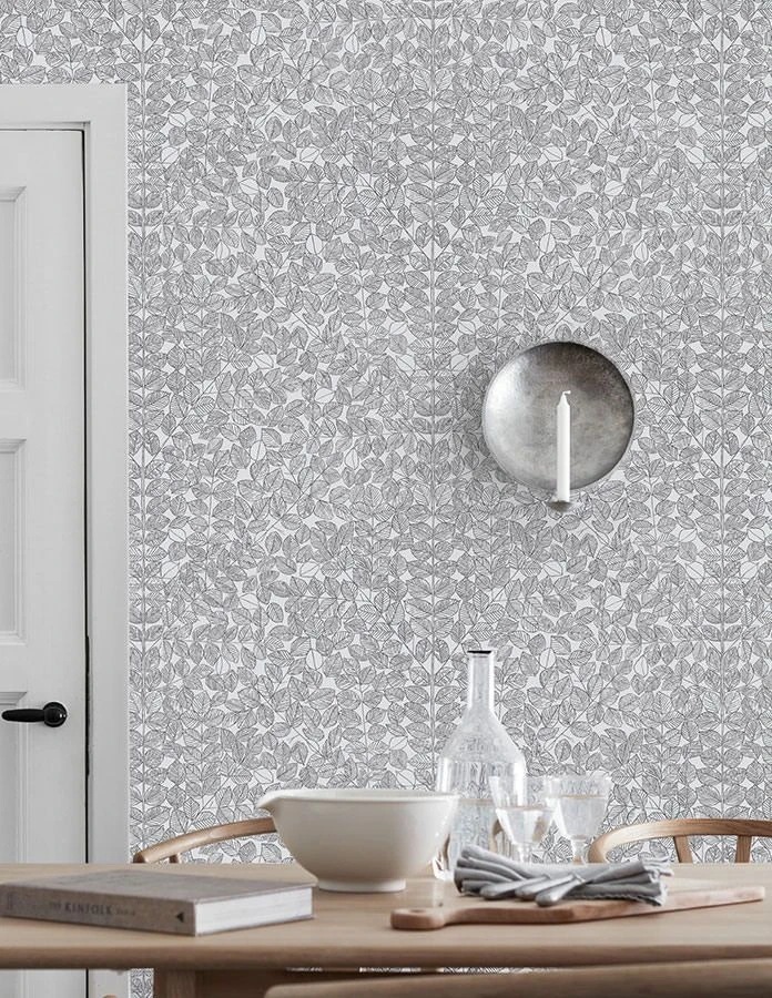 Das feingezeichnete Blattwerk der floralen Designer Tapete in Weiß und Anthrazit zeigt im Raum zwei besondere Gesichter. Das dichte aber willkürlich angeordnete Blättergeflecht wird durch einige unvollendete Elemente unterbrochen, die aus der Ferne betrachtet ein kunstvoll abstraktes Muster ergeben. Der sensible Blattcharakter bleibt gleichwohl erhalten.