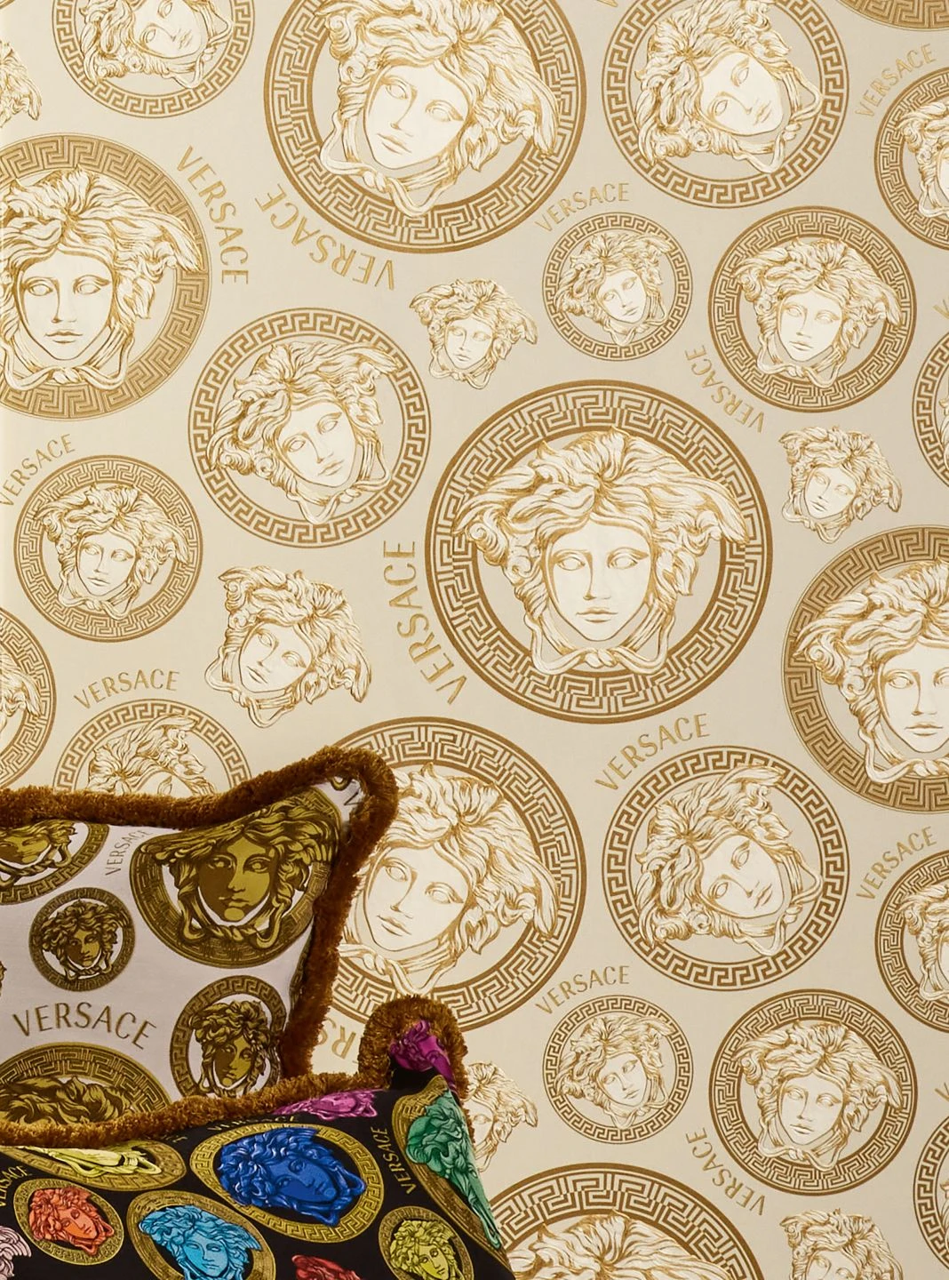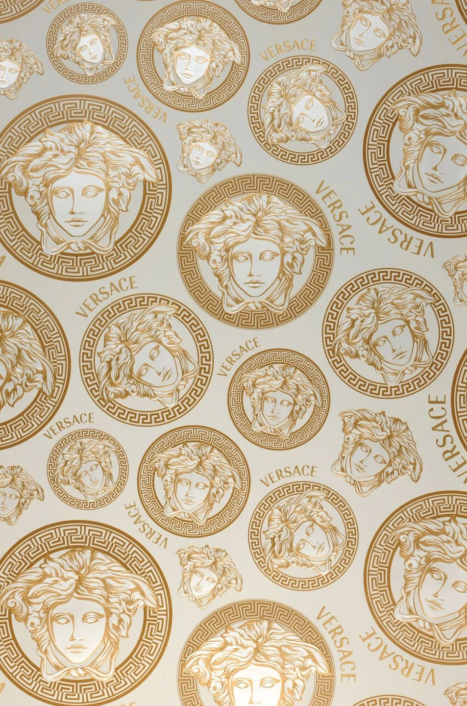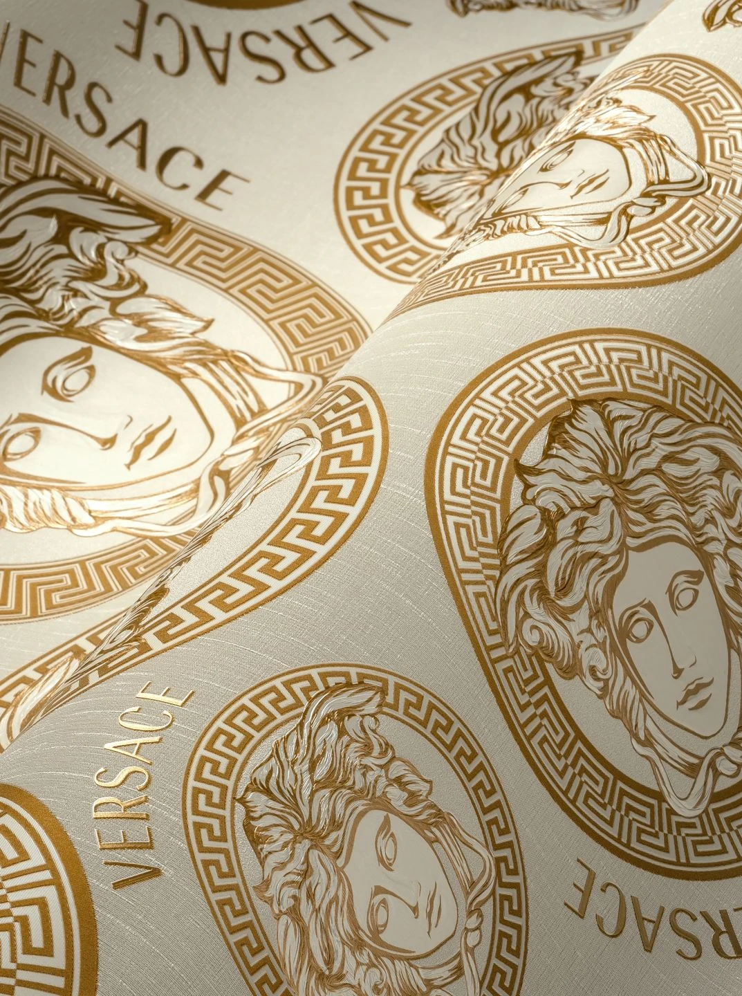 Medusa-Ornamente im Stil der griechischen Antike, kreisförmig umrahmt vom typischen Mäander-Muster als Borte, zieren Versaces Vliestapete Athene. Das goldene Muster auf dem cremeweißen Hintergrund wirkt klassisch und hochwertig. Auf der scheuerbeständigen Vinyloberfläche sind die antik anmutenden Ornamente als Relief fühlbar. Gleichzeitig ist ihre Anordnung modern aufgelockert durch Schriftzüge mit dem Markennamen.
