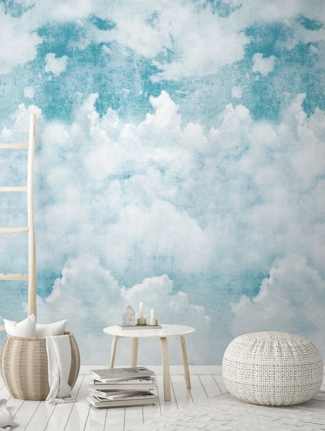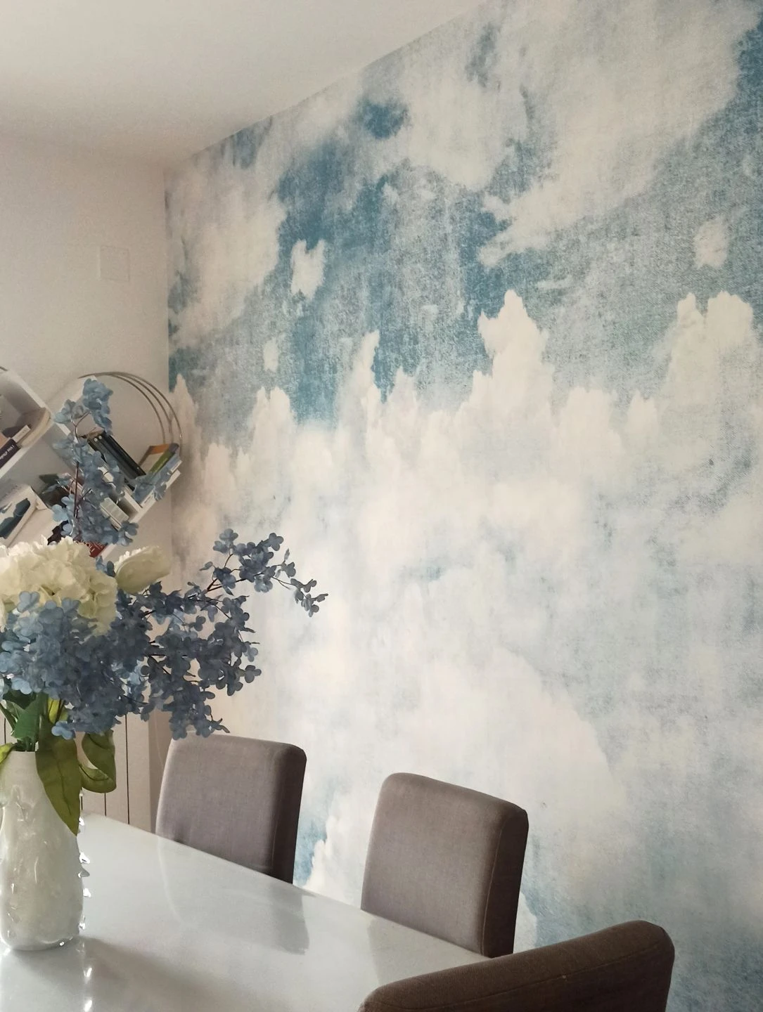 Himmlische Aussichten warten mit dieser romantischen Tapete auf alle, die auf Wolken schweben wollen. Und auf was für welchen! Diese hier sind weich wie Zuckerwatte und bilden ein herrliches Formenspiel. Das Wandbild, bestehend aus drei Bahnen, hat eine hoch waschbeständige Vinyloberfläche und kann auch Möbelfronten dekorieren.