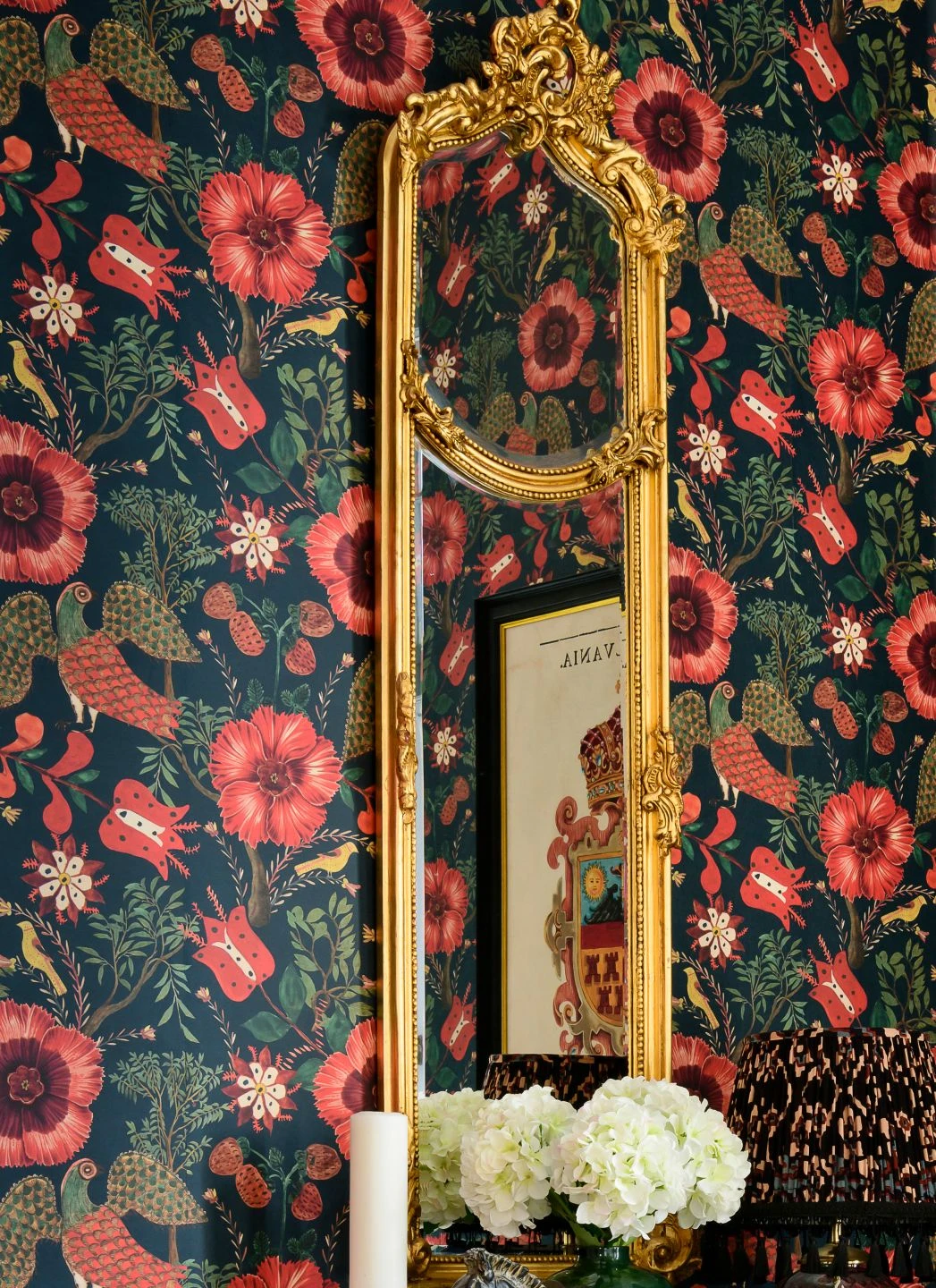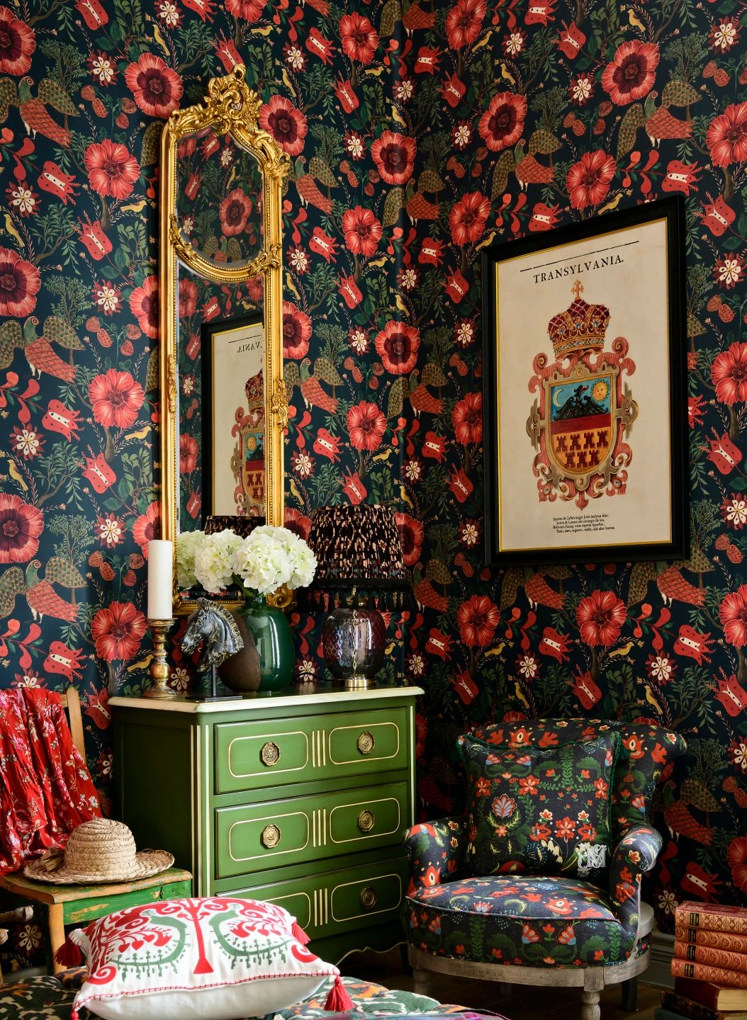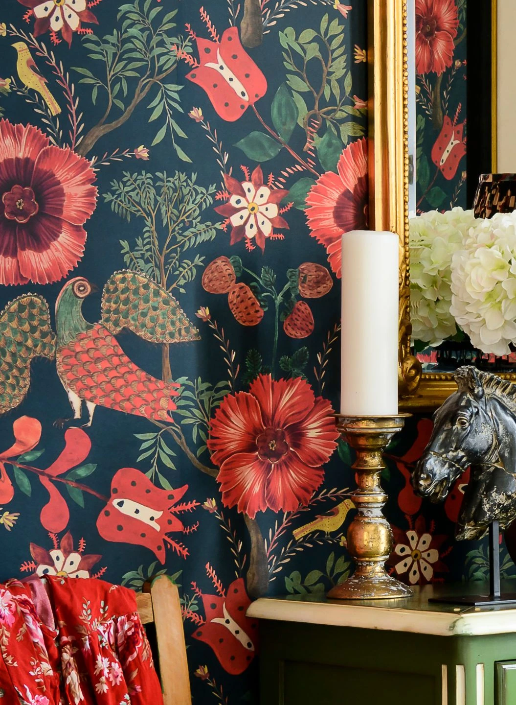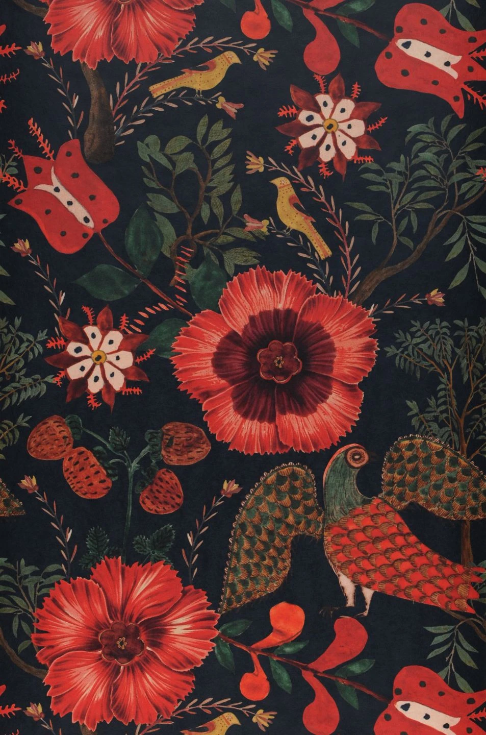Die traditionelle folkloristische Kunst wird hier in ein heutiges, zeitgemäßes Wandbild überführt und kreiert eine faszinierende Raumwirkung. Die Blumen, Blätter und Früchte in verschiedenen Abstufungen der Stilisierung sind auf dem anthrazitgrauen Grund wie zufällig angeordnet. Dazwischen leuchten stilisierte Vögel hervor. Intensive, Energie spendende Rottöne sorgen für ein warmes, lebhaftes Ambiente voller Charme.